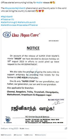 रजनीकांत की फिल्म 'जेलर' देखने के लिए इन 2 शहरों में हुई छुट्टी, कंपनी ...