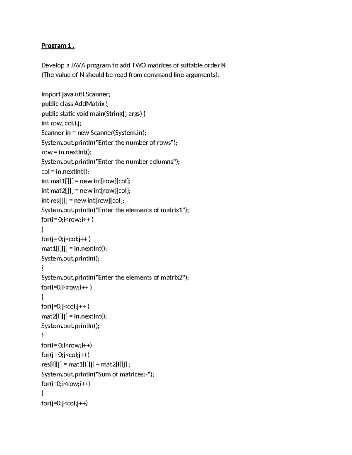 Java - notes - Program 1. Develop a JAVA program to add TWO matrices of ...