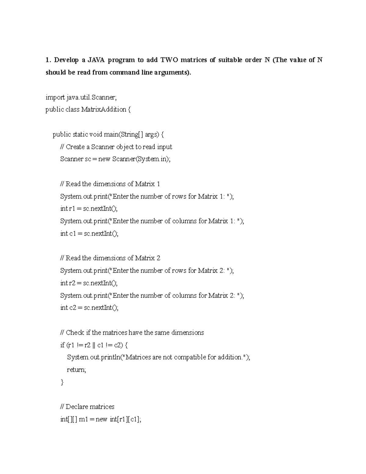 Java Programs Lab - Program 01 : Matrix Addition Develop a JAVA program ...