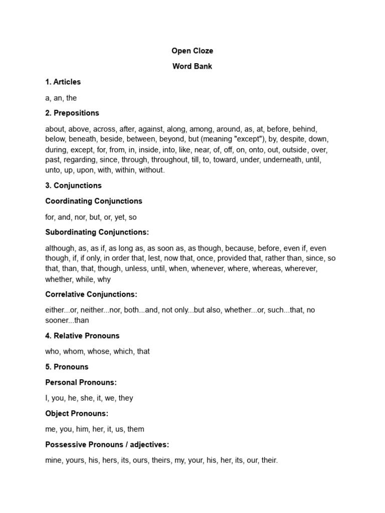 Open Cloze - Vocabulary Bank | PDF | Pronoun | Syntax