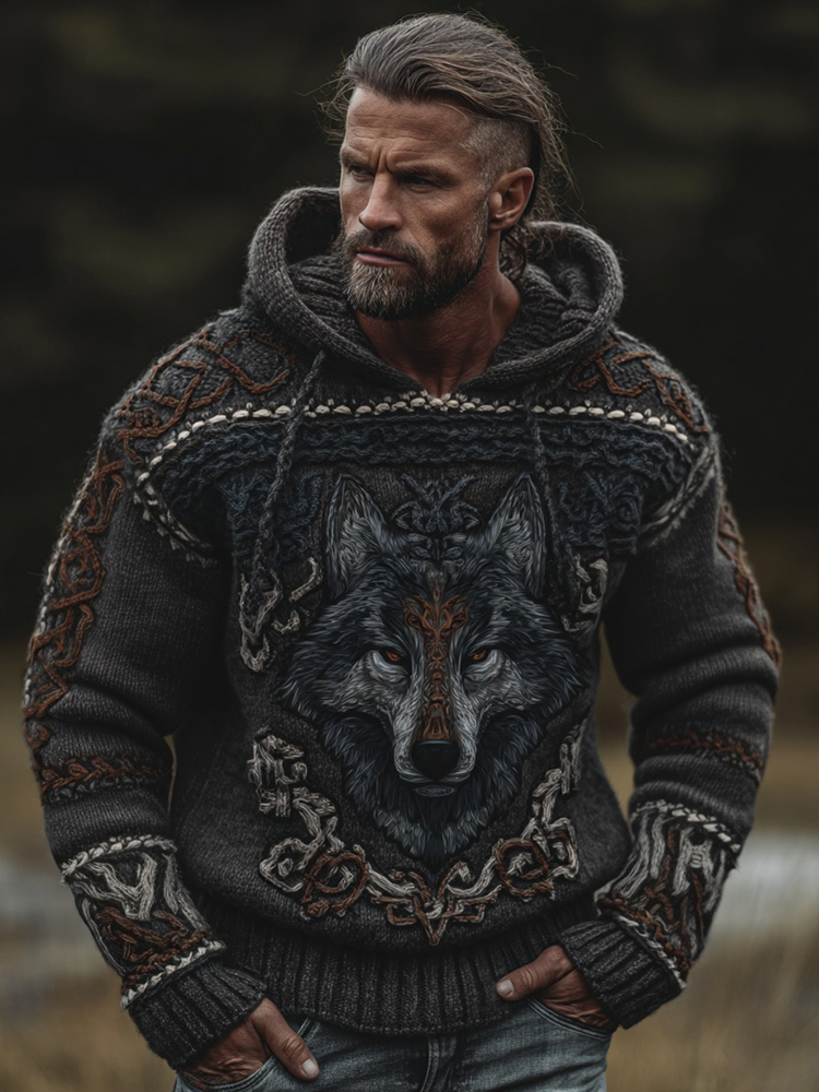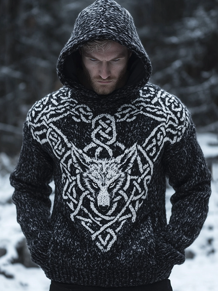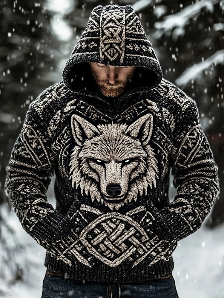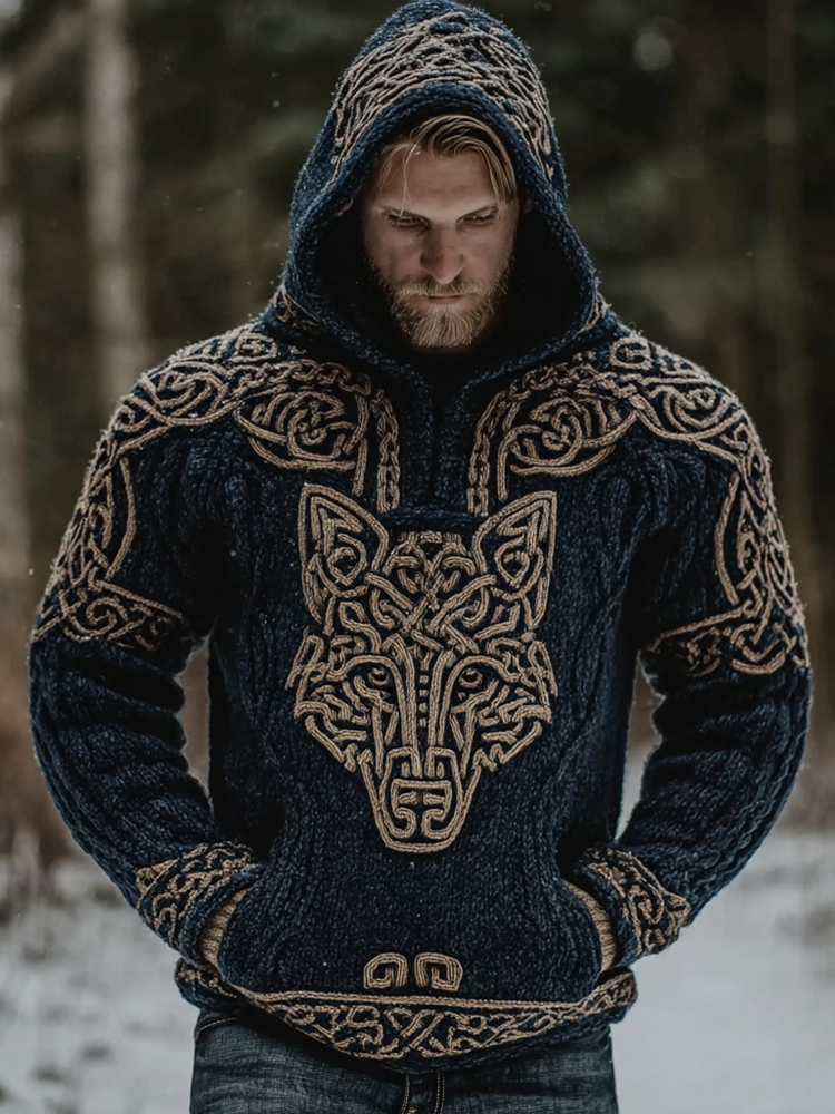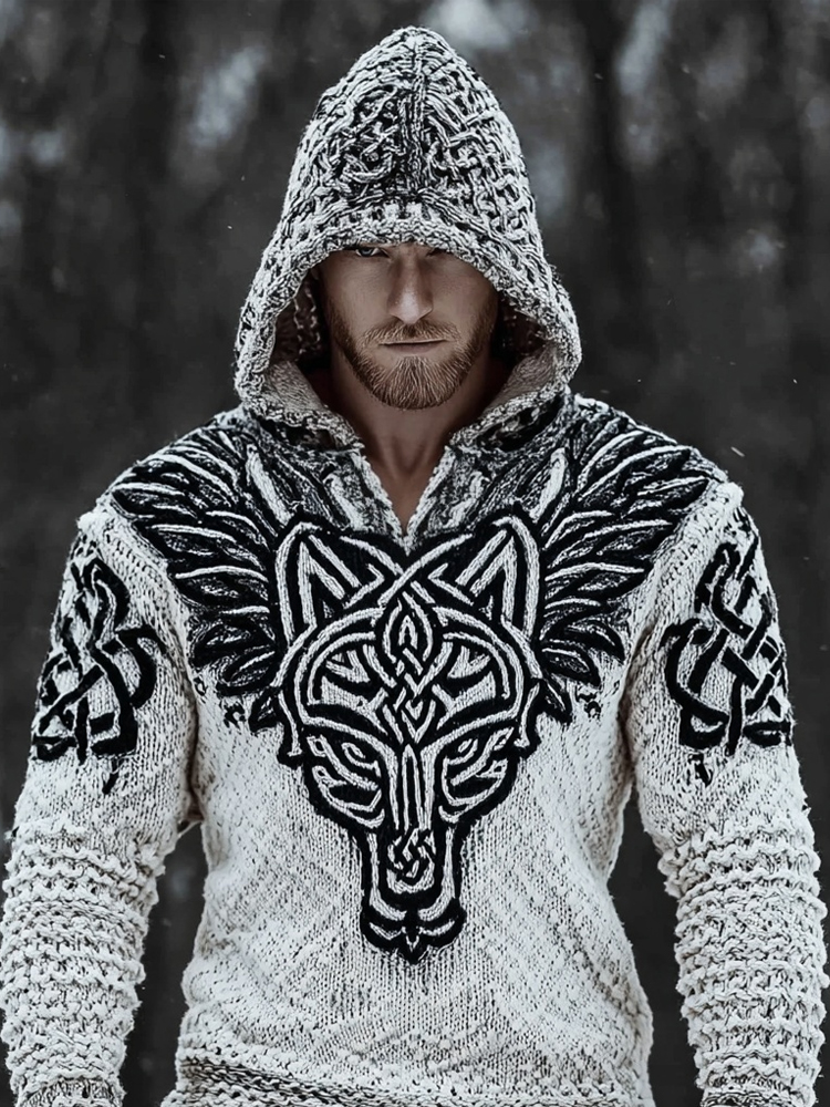 Men's Wolf Inspired Viking Celtic Jacquard Chunky Hooded Sweater – sunmerr