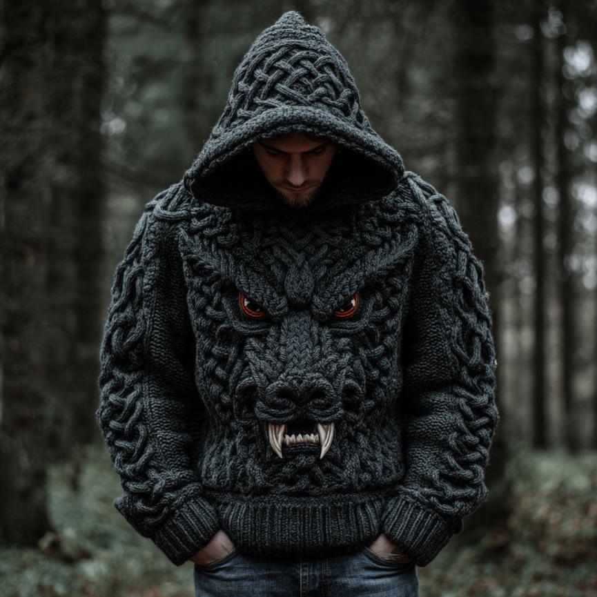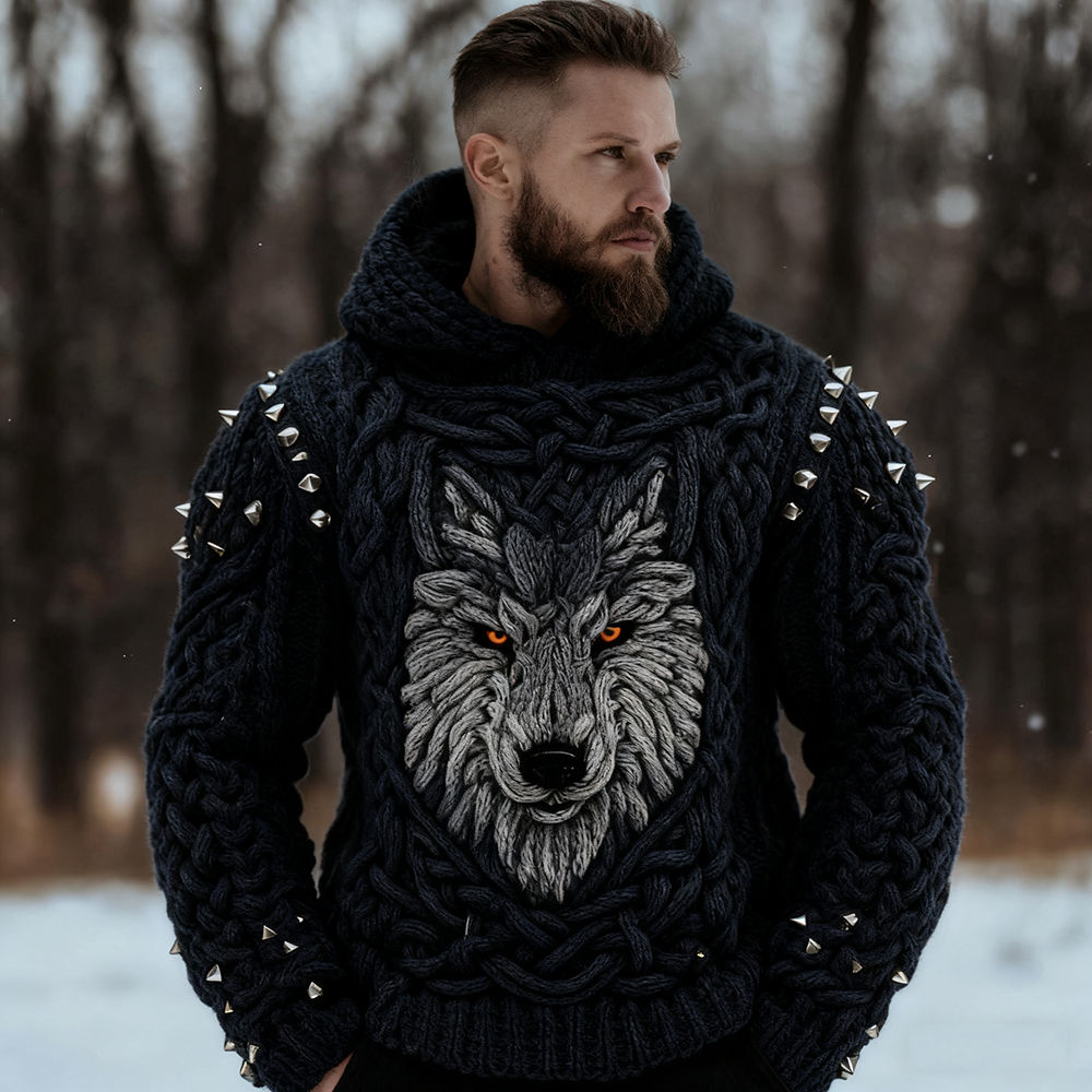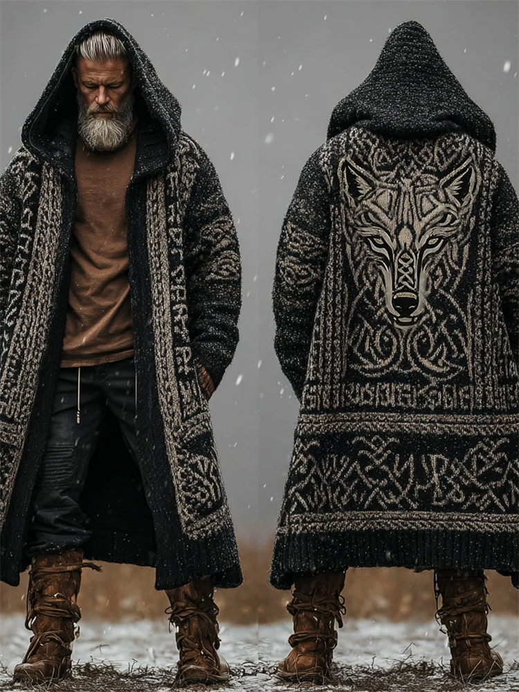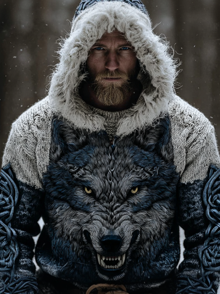 Men's Wolf Inspired Viking Celtic Jacquard Chunky Hooded Sweater – sunmerr