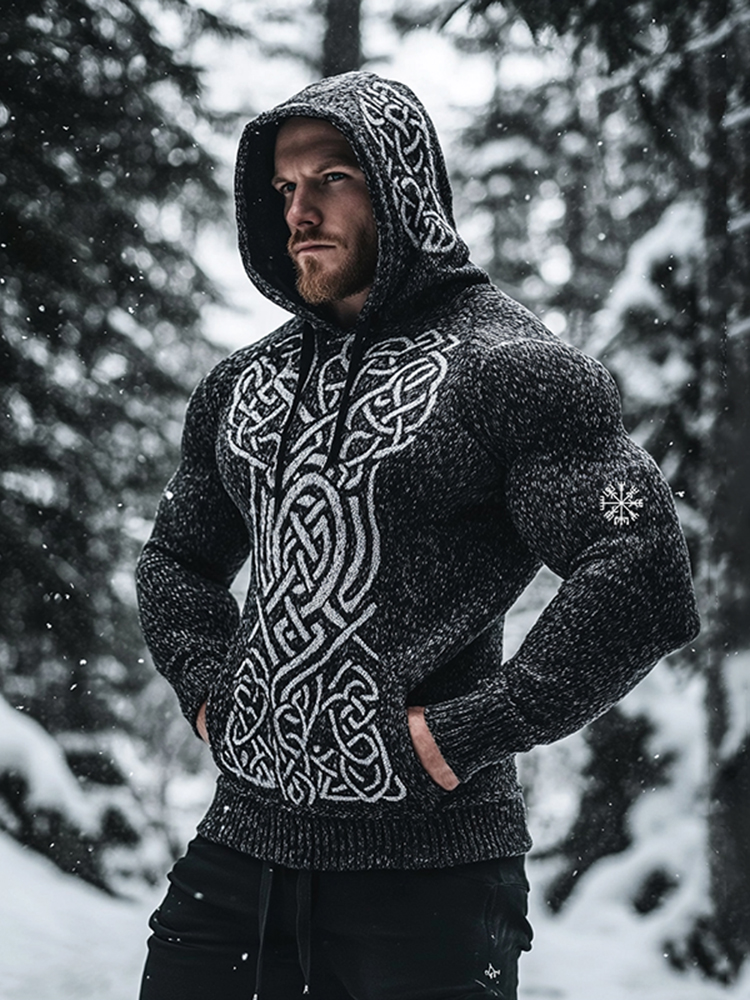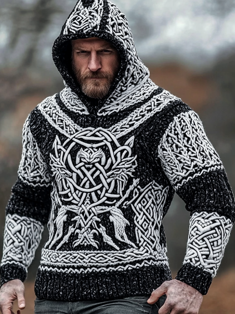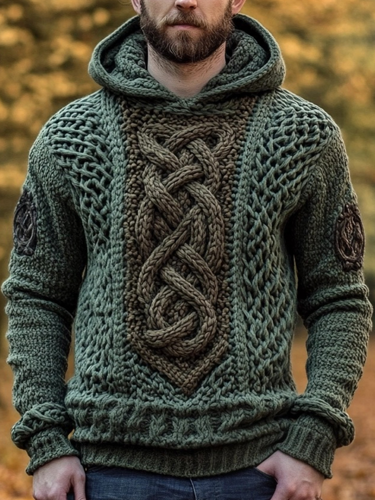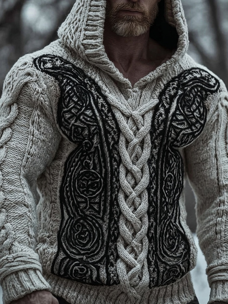 Men's Viking Celtic Knot Art Jacquard Chunky Knitted Cozy Hooded Sweater