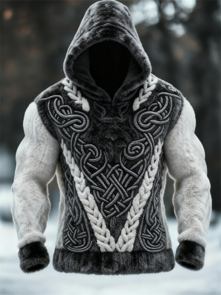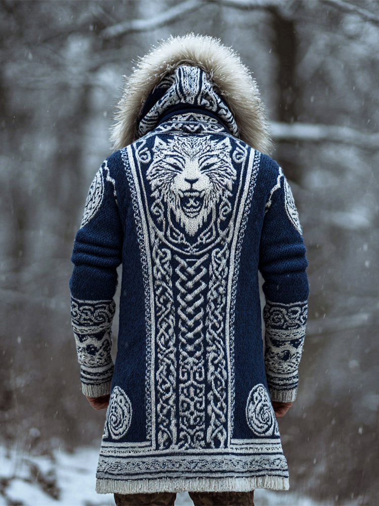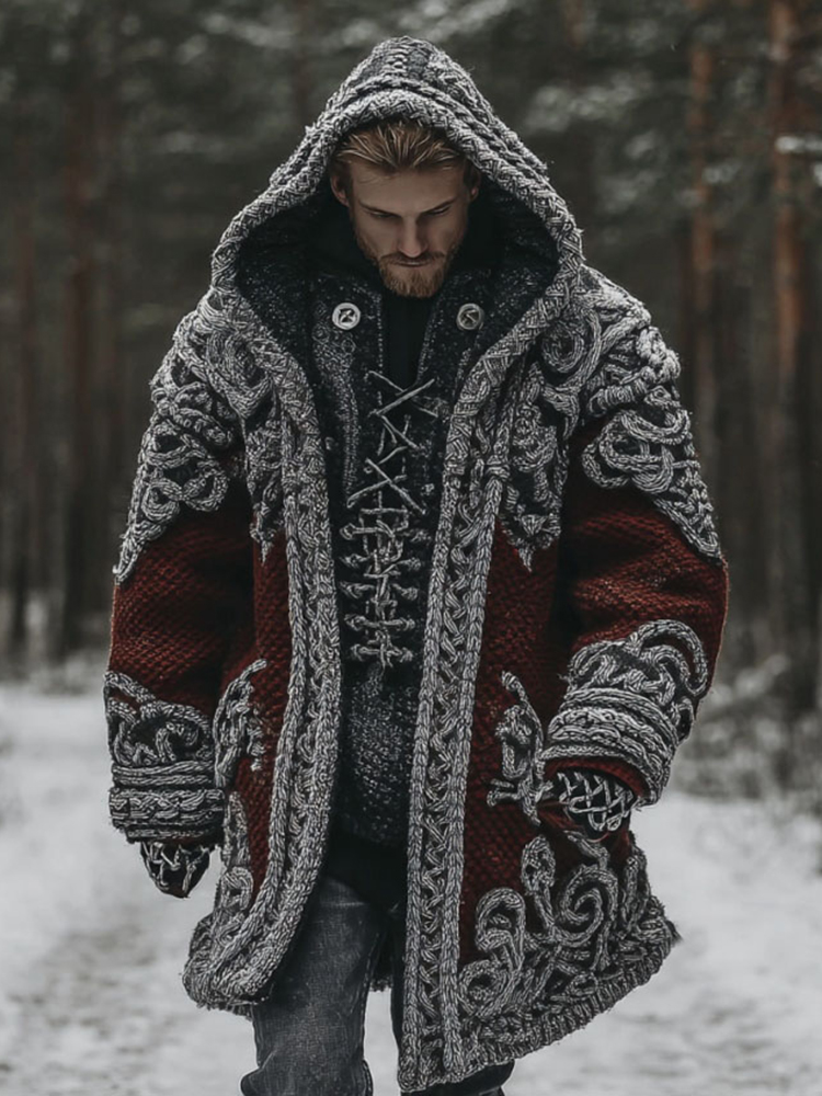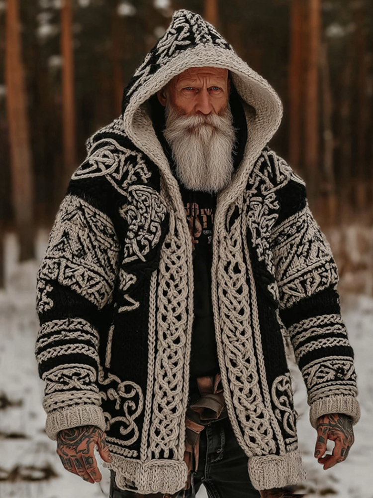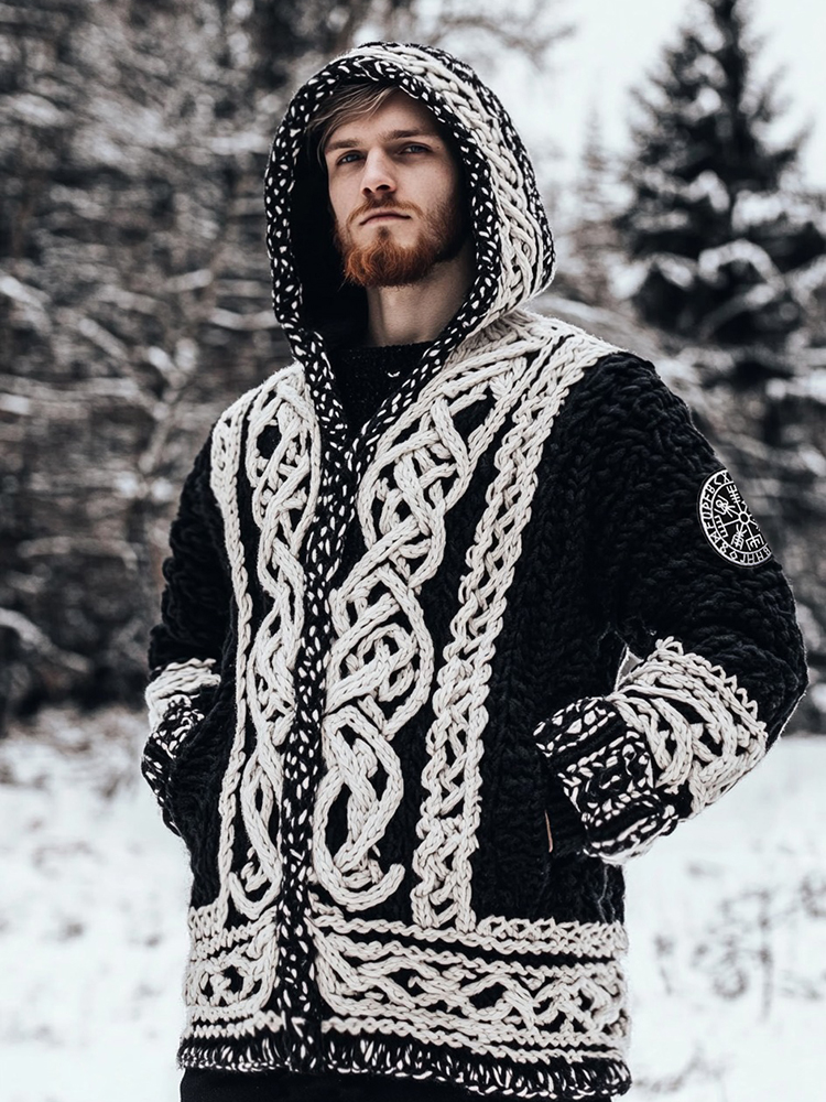 Men's Viking Celtic Knot Art Jacquard Chunky Knitted Cozy Hooded Sweater