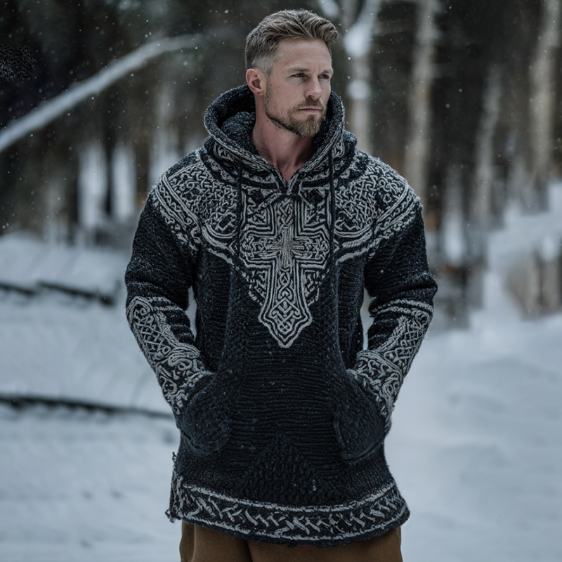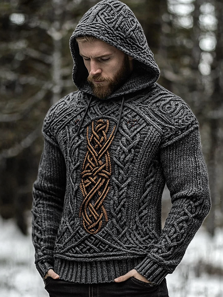 Men's Vintage Viking Celtic Knot Art Cozy Jacquard Knit Hooded Sweater