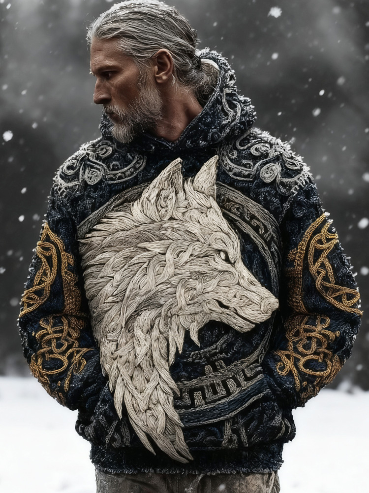 Men's Viking Print Retro Wolf Inspired Celtic Jacquard Chunky Hooded ...