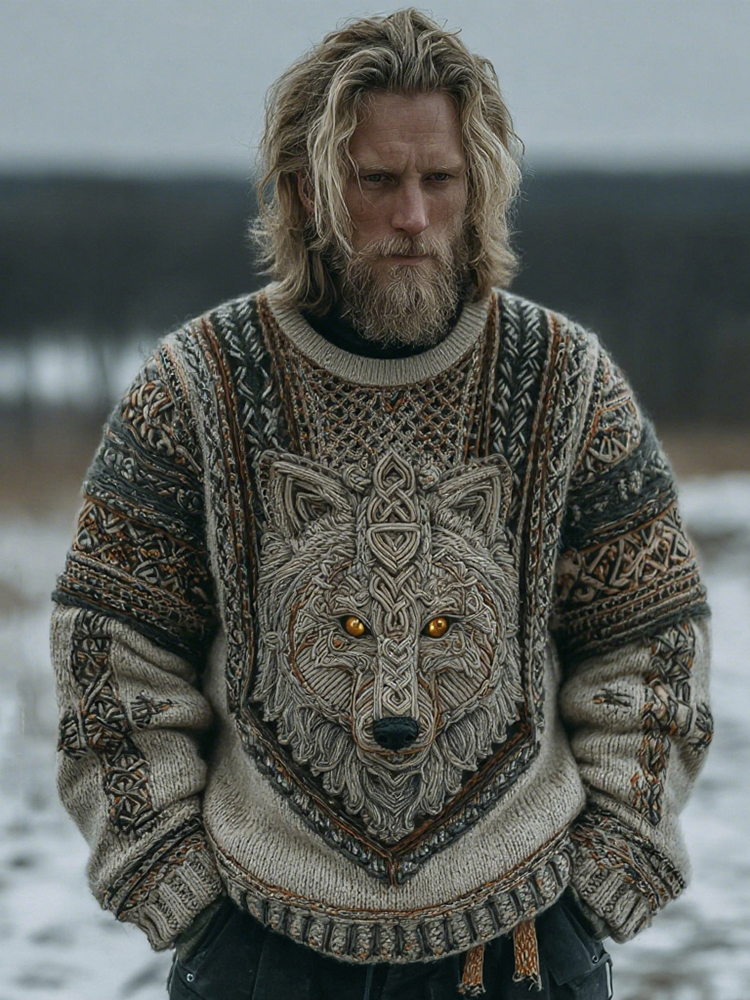 Men's Wolf Inspired Viking Celtic Jacquard Cozy Sweater
