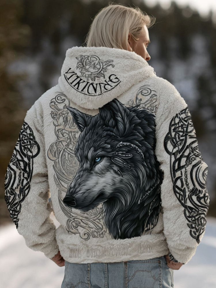 Men's Viking Celtic Wolf Pattern Art Flannel Cozy Warm Zipped Hooded ...