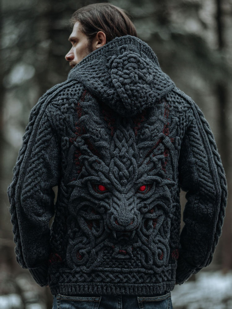 Dravoks Viking Celtic Giant Wolf Head Pattern Men's Knit Hooded Cardigan