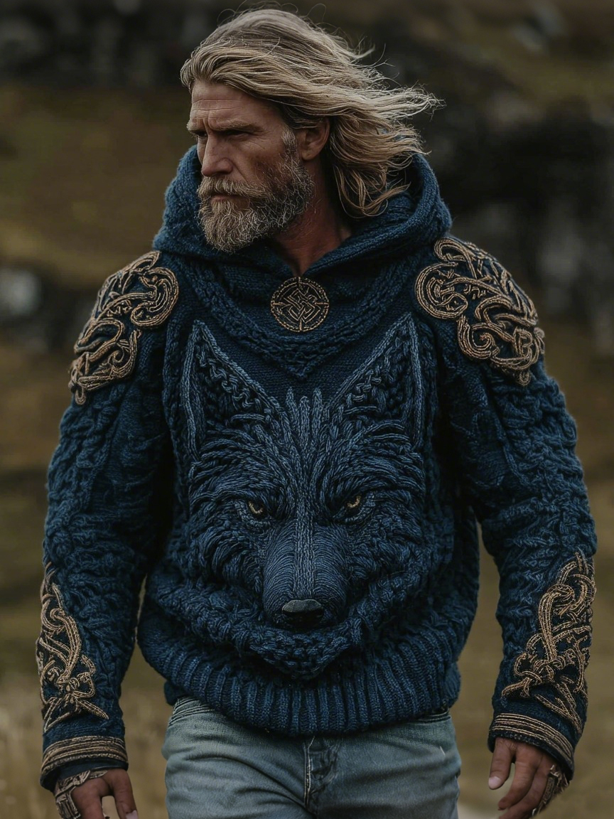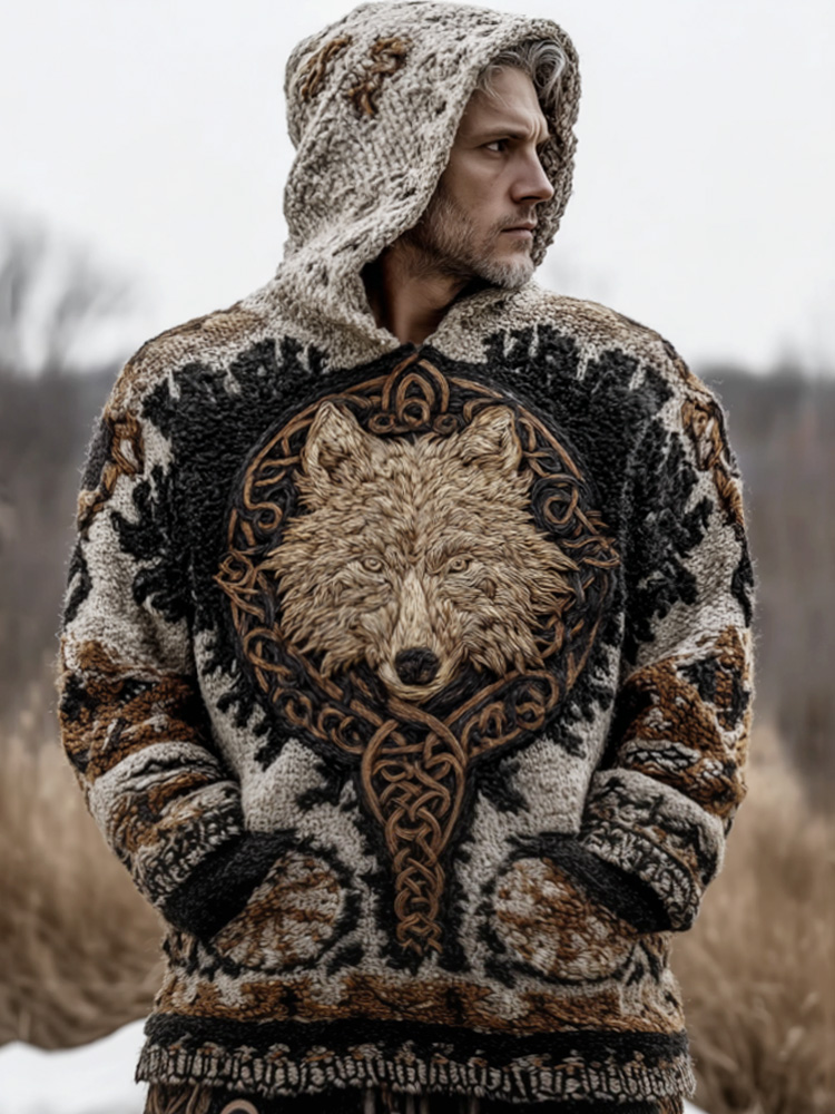 Vintage Wolf Inspired Viking Celtic Jacquard Hooded Sweater – sunmerr