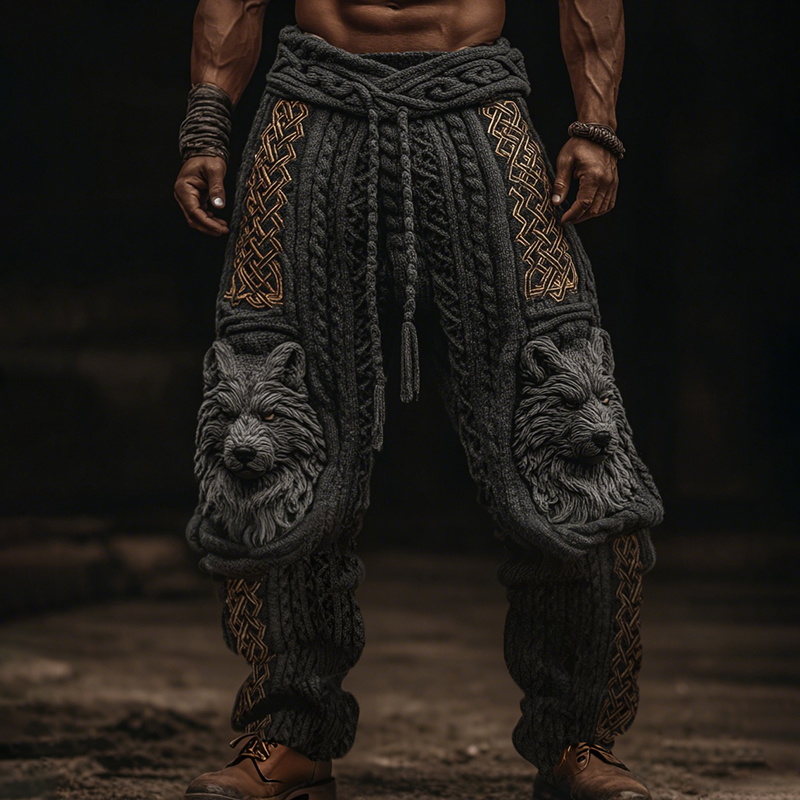 Dravoks Men's Vintage Viking Wolf Celtic Knot Cozy Chunky Knit Sweatpants
