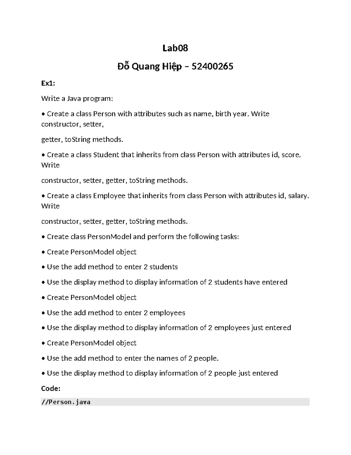 Lab08: Java Program for Person, Student, and Employee Classes (52400265 ...