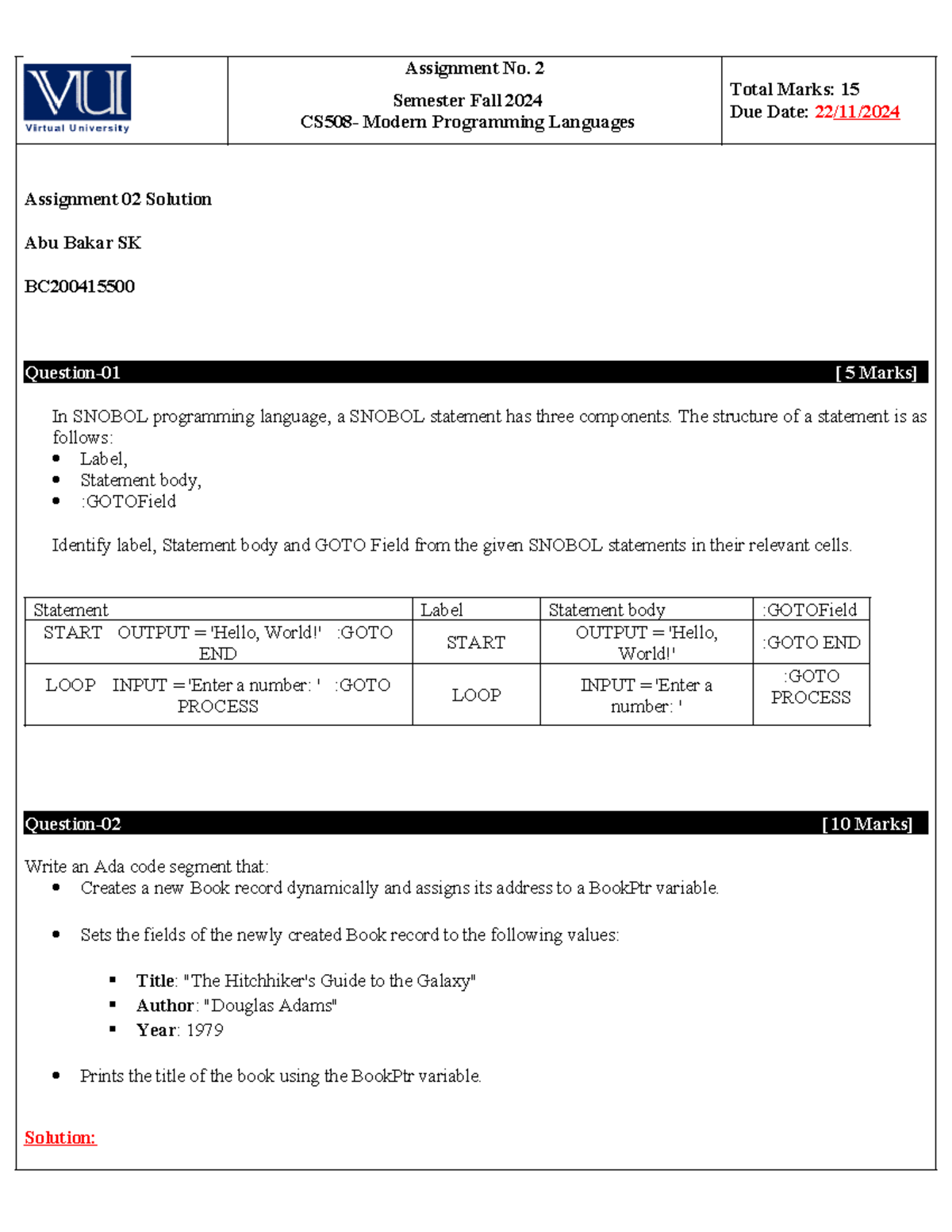 BC2004 Assignment 02: SNOBOL Programming Language Overview - Studocu