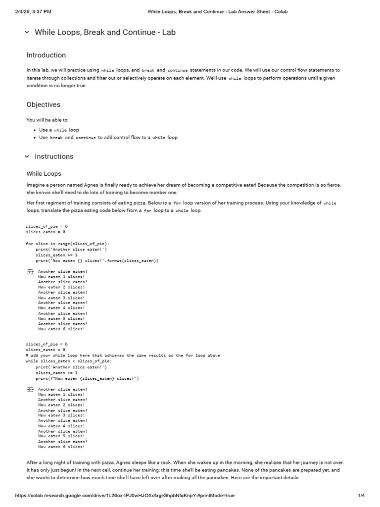 While Loops, Break and Continue - Lab Answer Sheet - Colab | PDF ...