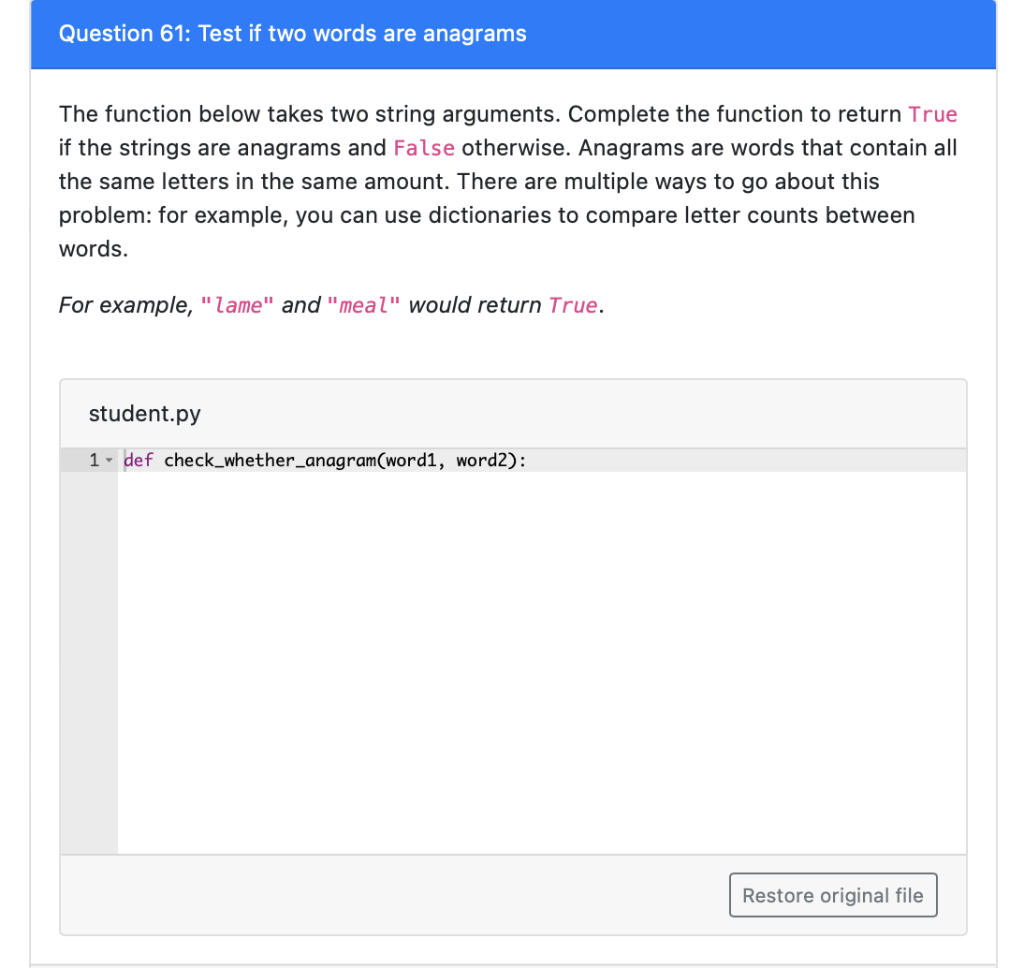 Solved Question 61: Test if two words are anagrams The | Chegg.com