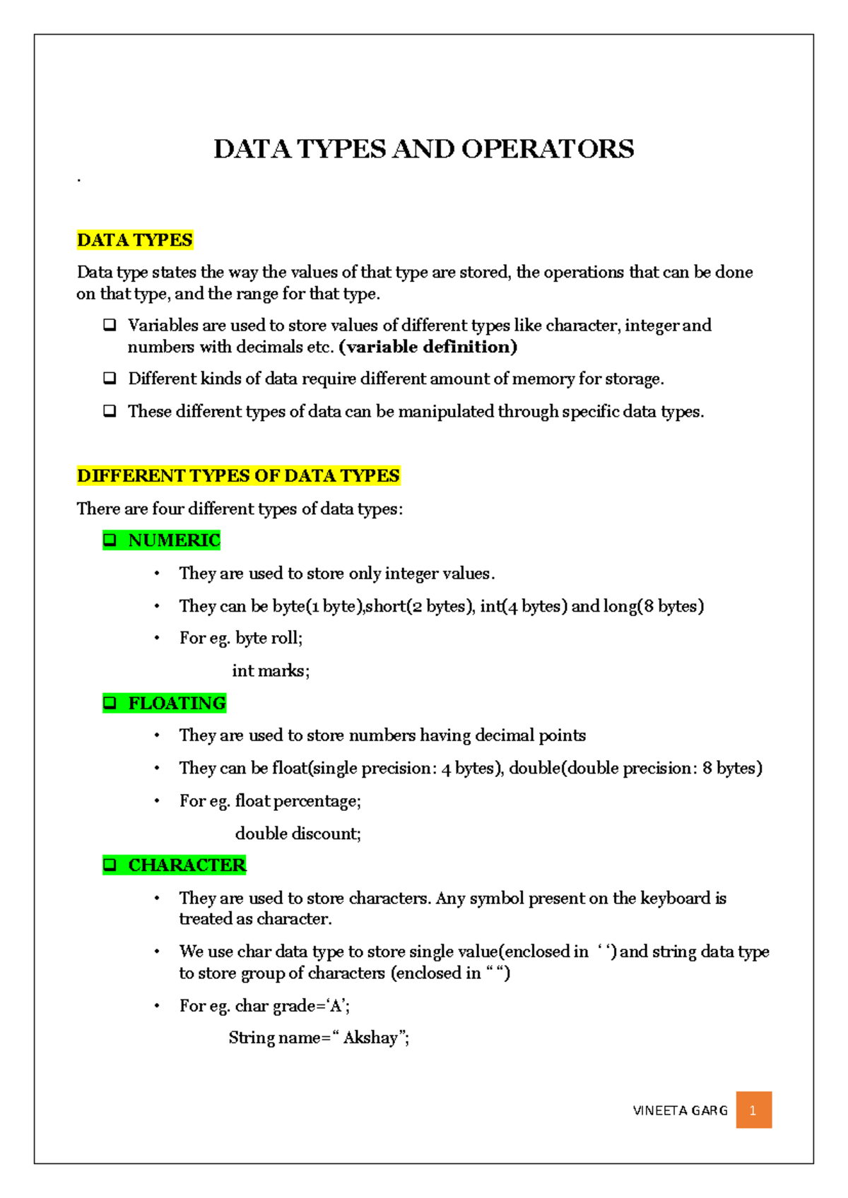 JAVA - java practical - DATA TYPES AND OPERATORS . DATA TYPES Data type ...
