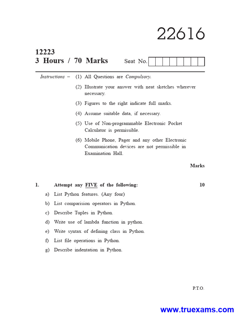22616 Programming with Python Question Paper - P.T. Instructions – (1 ...