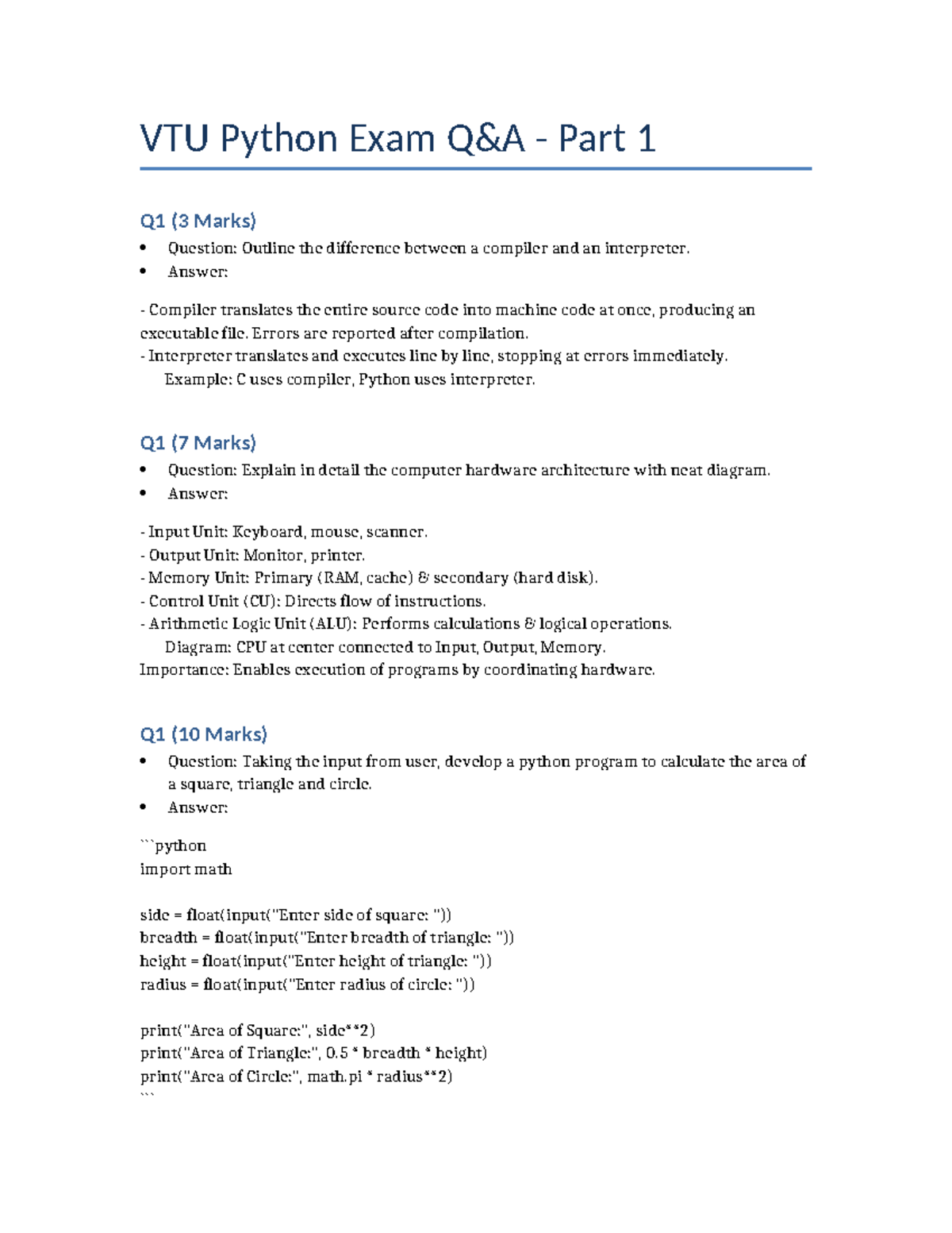 1st Year VTU Python: Important Questions & Answers for Exams - Studocu