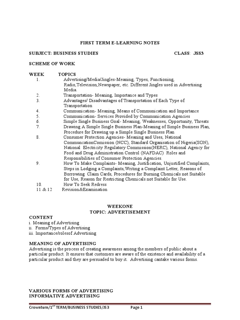 JSS3 Business Studies Lesson Notes | 1st, 2nd & 3rd Term | PDF ...