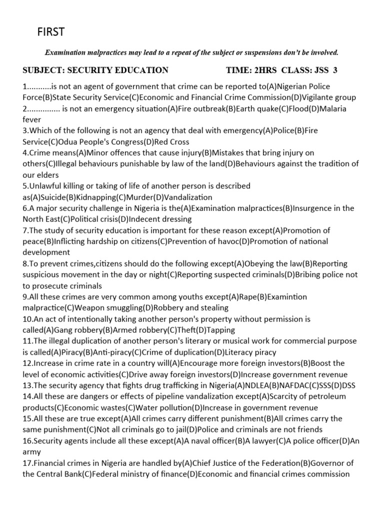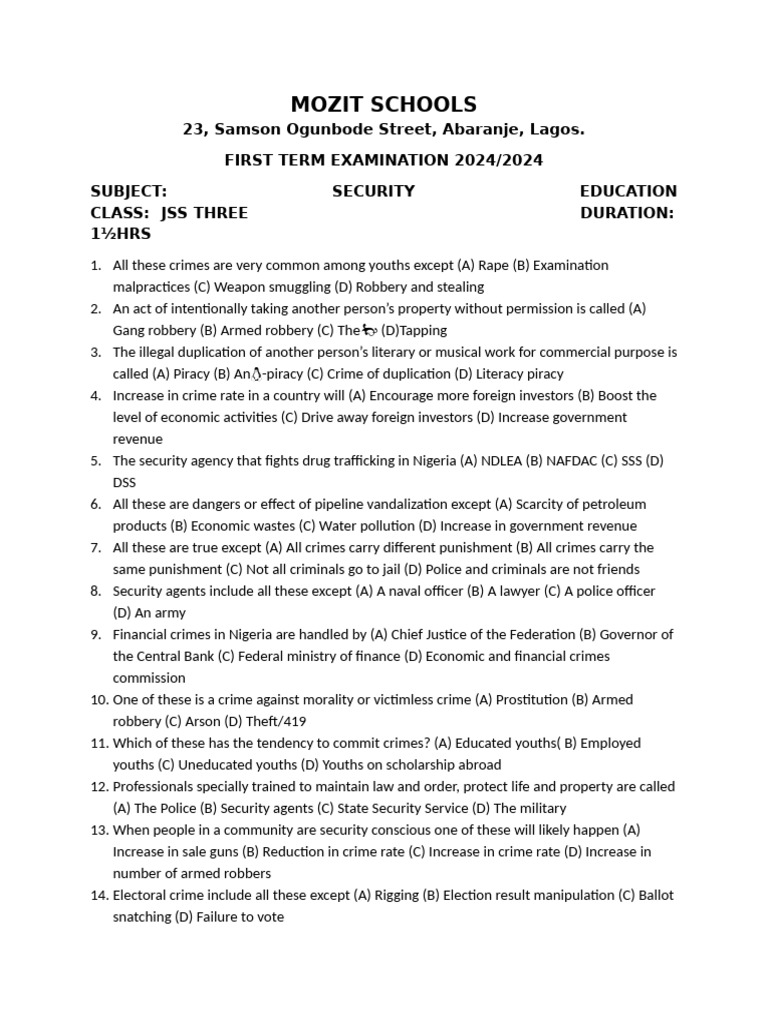 JSS3 Security Education Exam Questions | PDF | Crimes | Crime & Violence