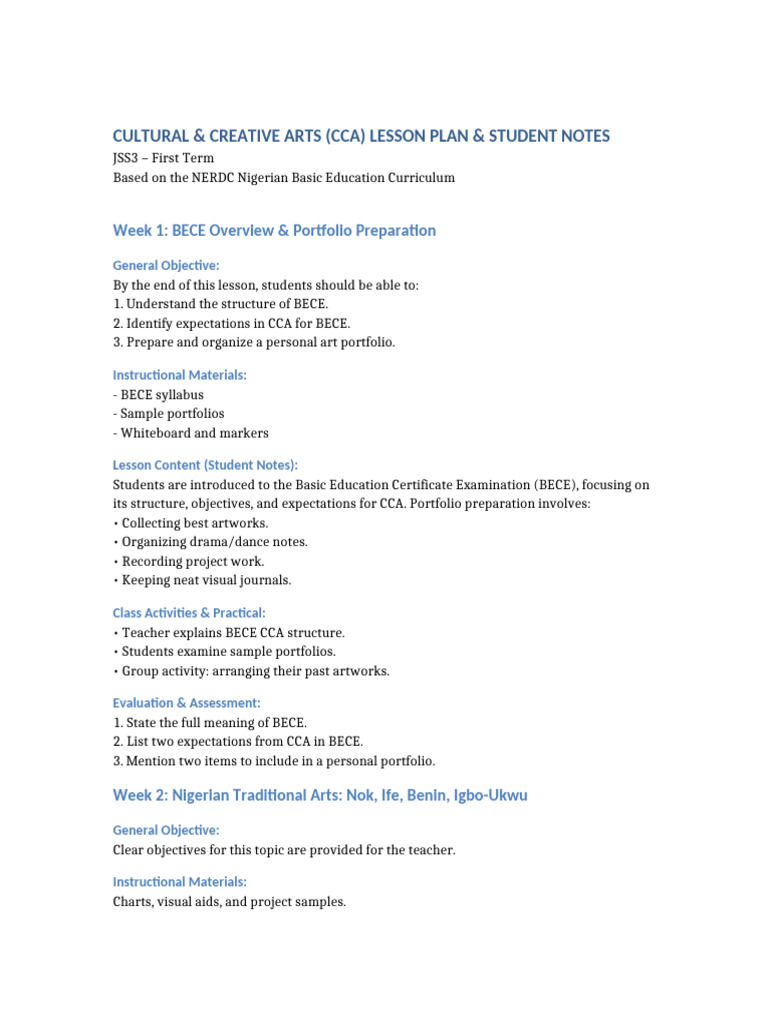 JSS3 CCA First Term Lesson Plan | PDF | Teachers | Lesson Plan