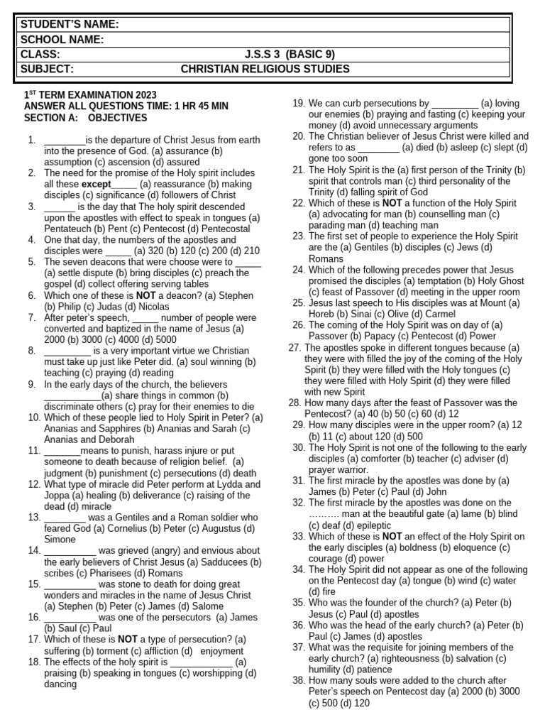 JSS3 First Term CRS Exam Questions | PDF | Paul The Apostle | Jesus