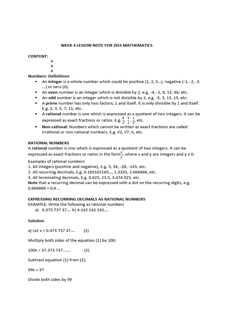 Week 4 Lesson Note For JSS3 Mathematics | PDF | Numbers | Pi