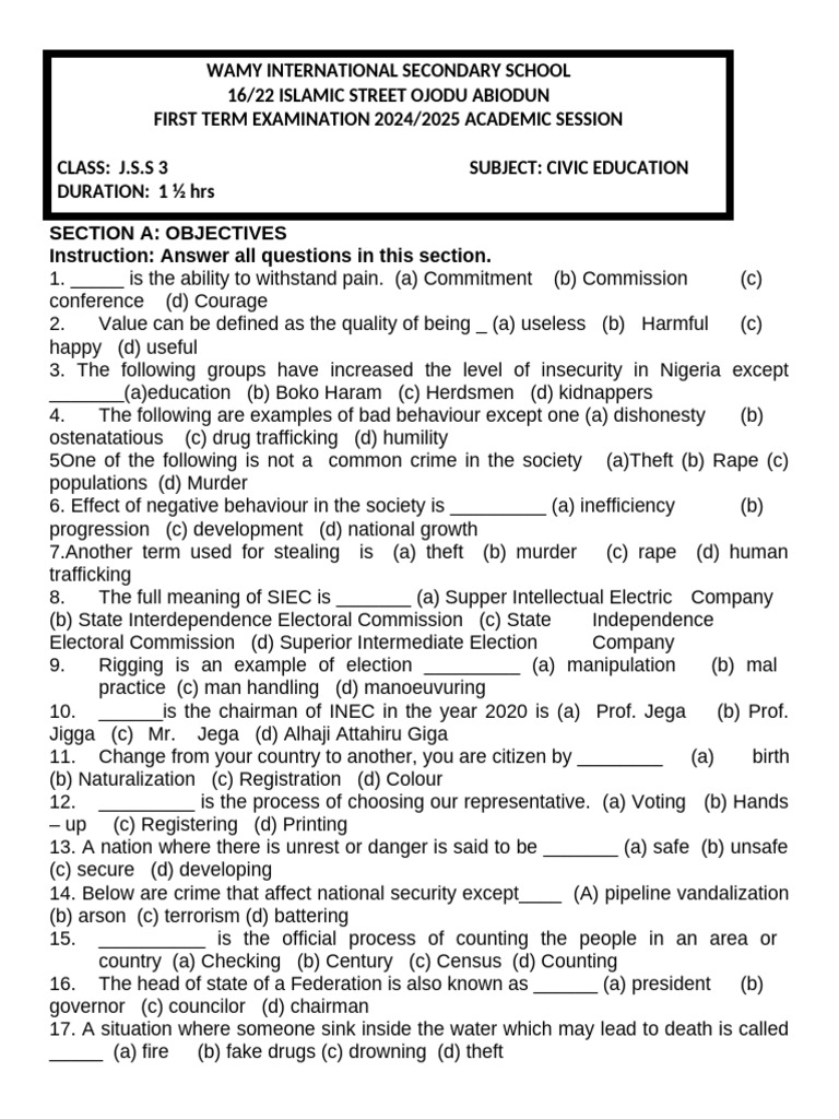 JSS3 Civic First Term Exam 2023-2024 | PDF | Crimes | Crime & Violence