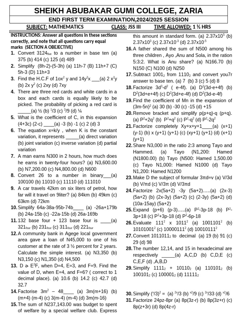 JSS3 First Term Mathematics Exam Questions | PDF | Elementary ...