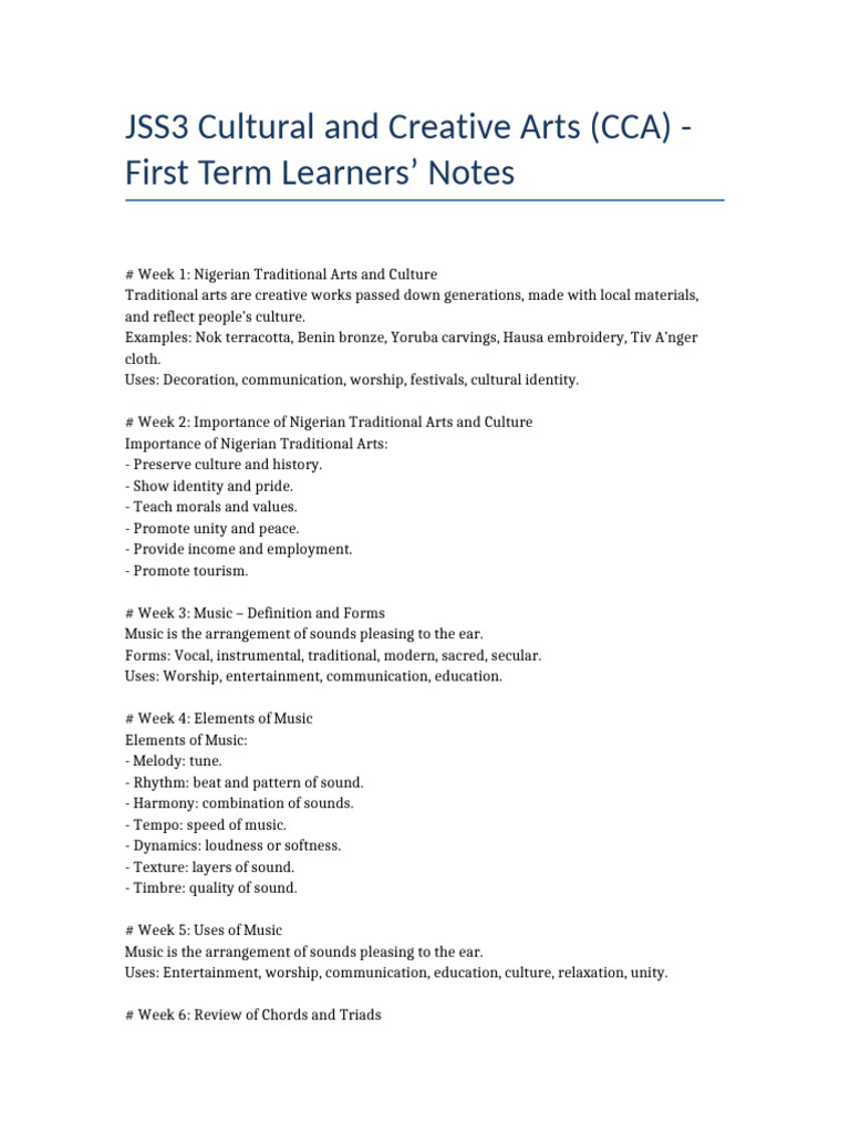 Cultural and Creative Arts Lesson Notes for JSS3 (Basic 9) First Term