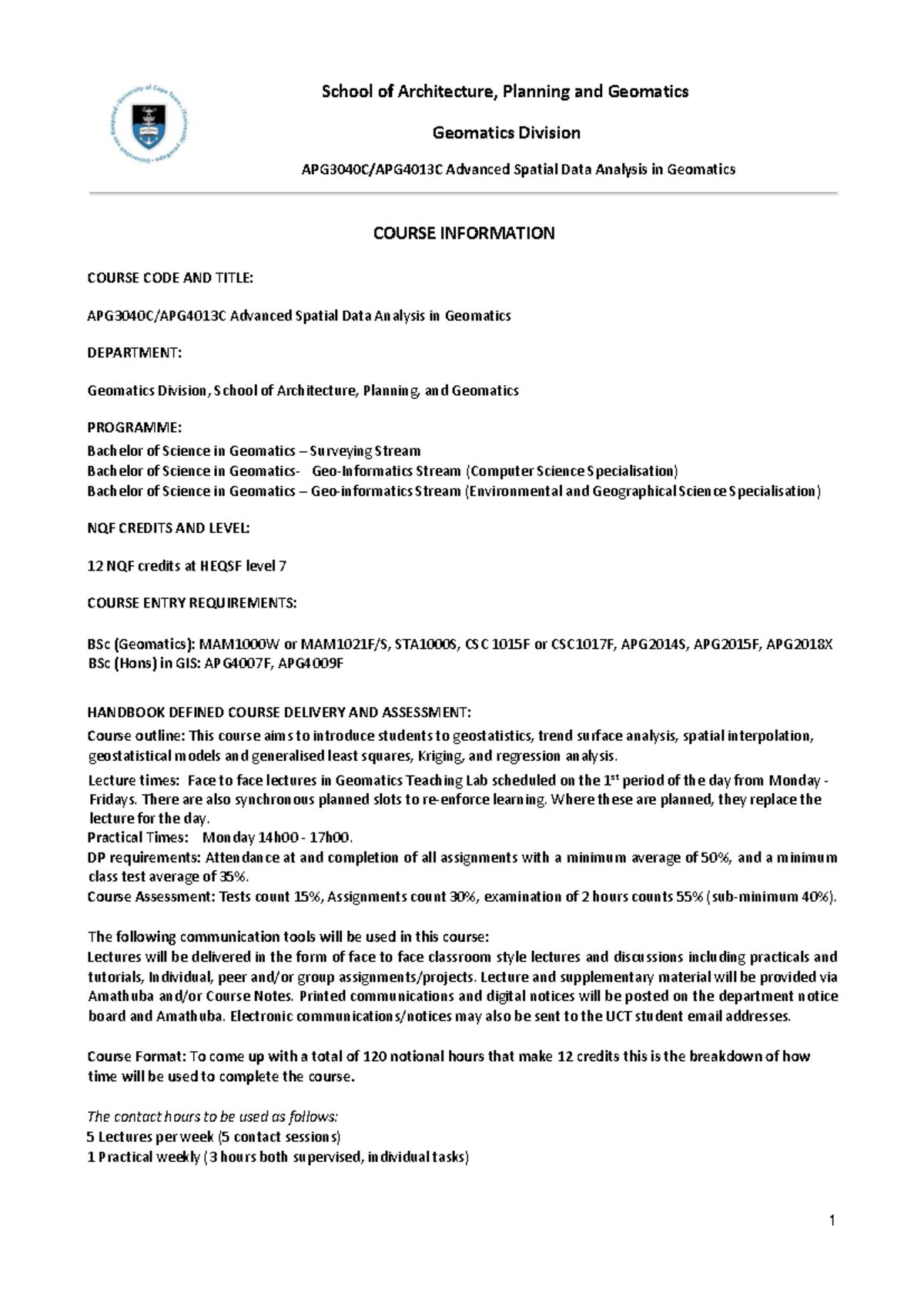 APG3040C/APG4013C Advanced Spatial Data Analysis Course Outline - Studocu