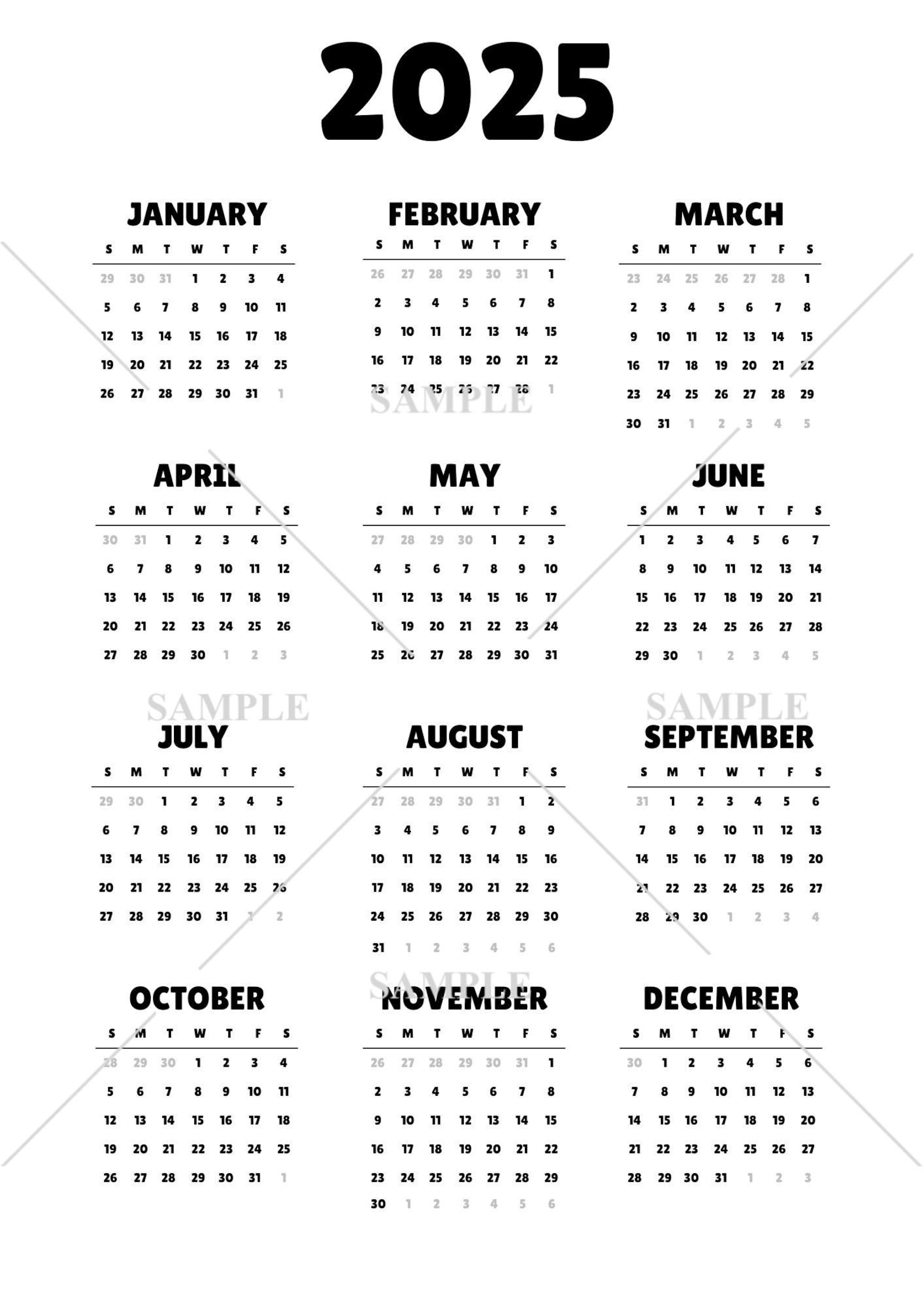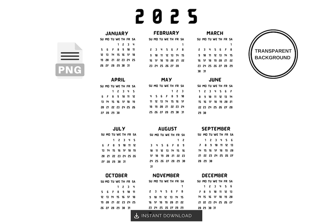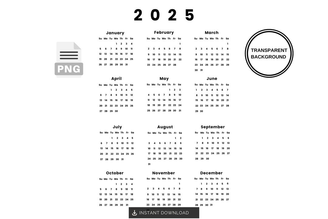2025 Calendar PNG SVG JPG - Transparent Background Clip Art - Instant ...