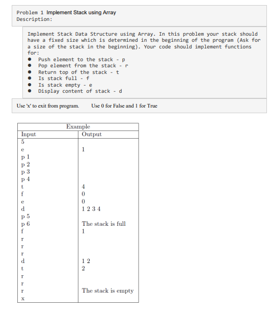 Solved Problem 1 Implement Stack using Array Description: | Chegg.com