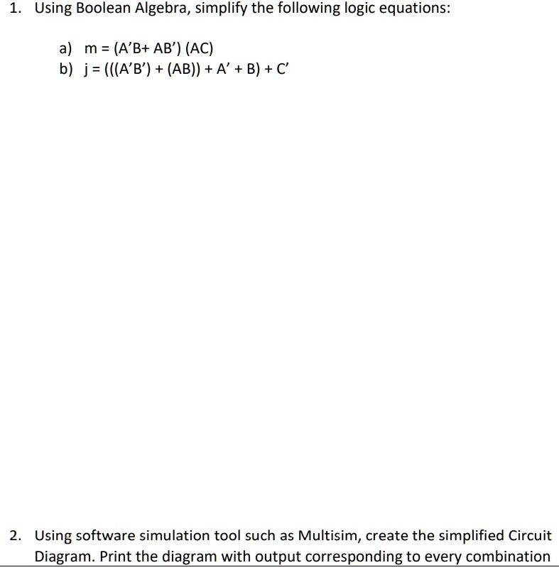 1. Using Boolean Algebra, simplify the following logic equations: a) m ...