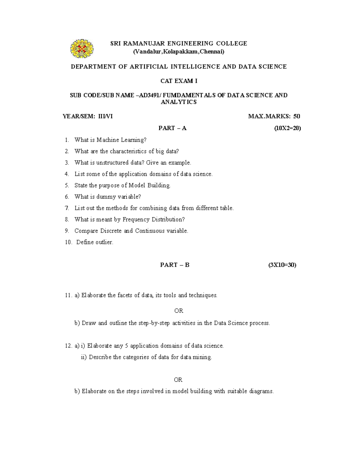 AD3491 Fundamentals of Data Science & Analytics - CAT Exam I Questions ...
