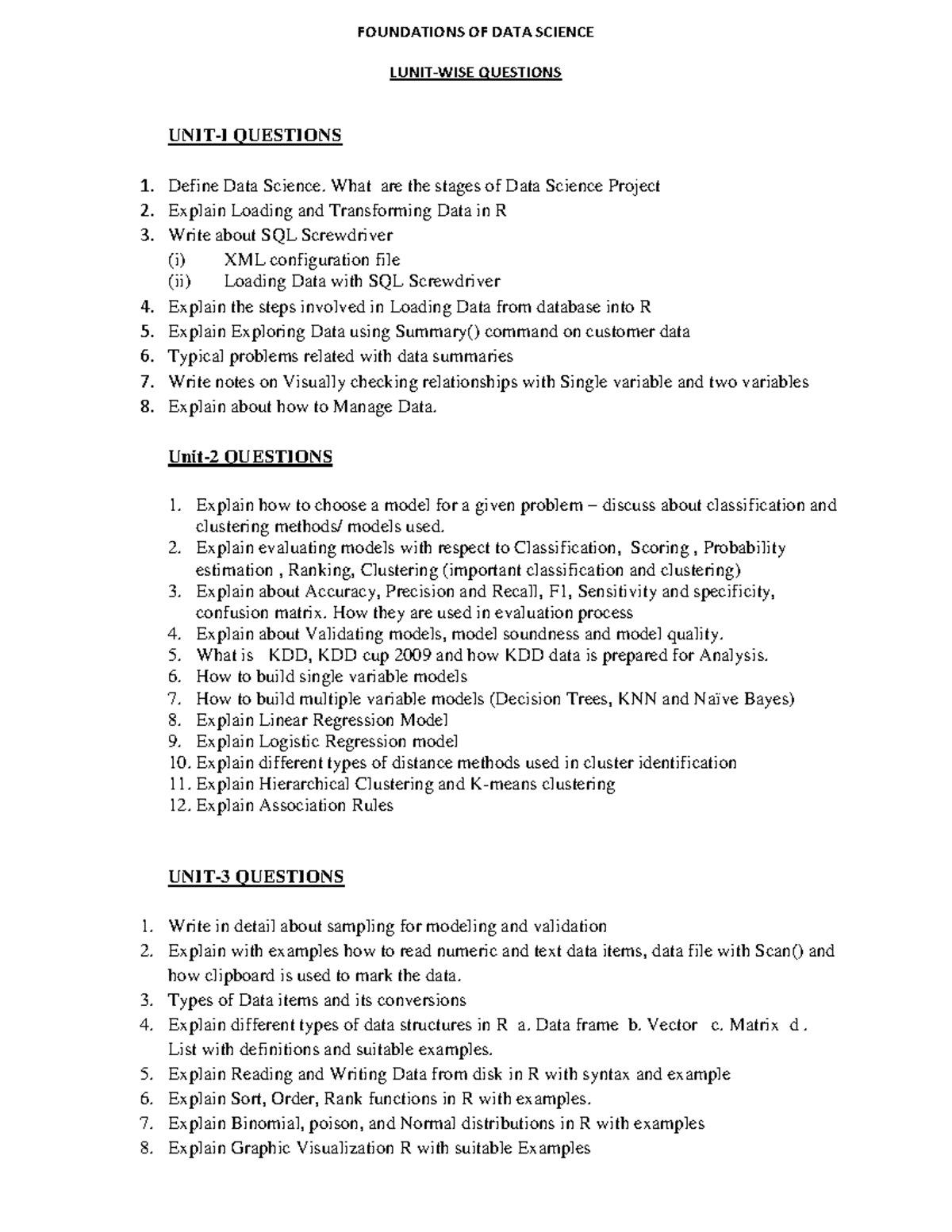 Data Science Sem 1 Questions Bank: Key Concepts & Techniques - Studocu