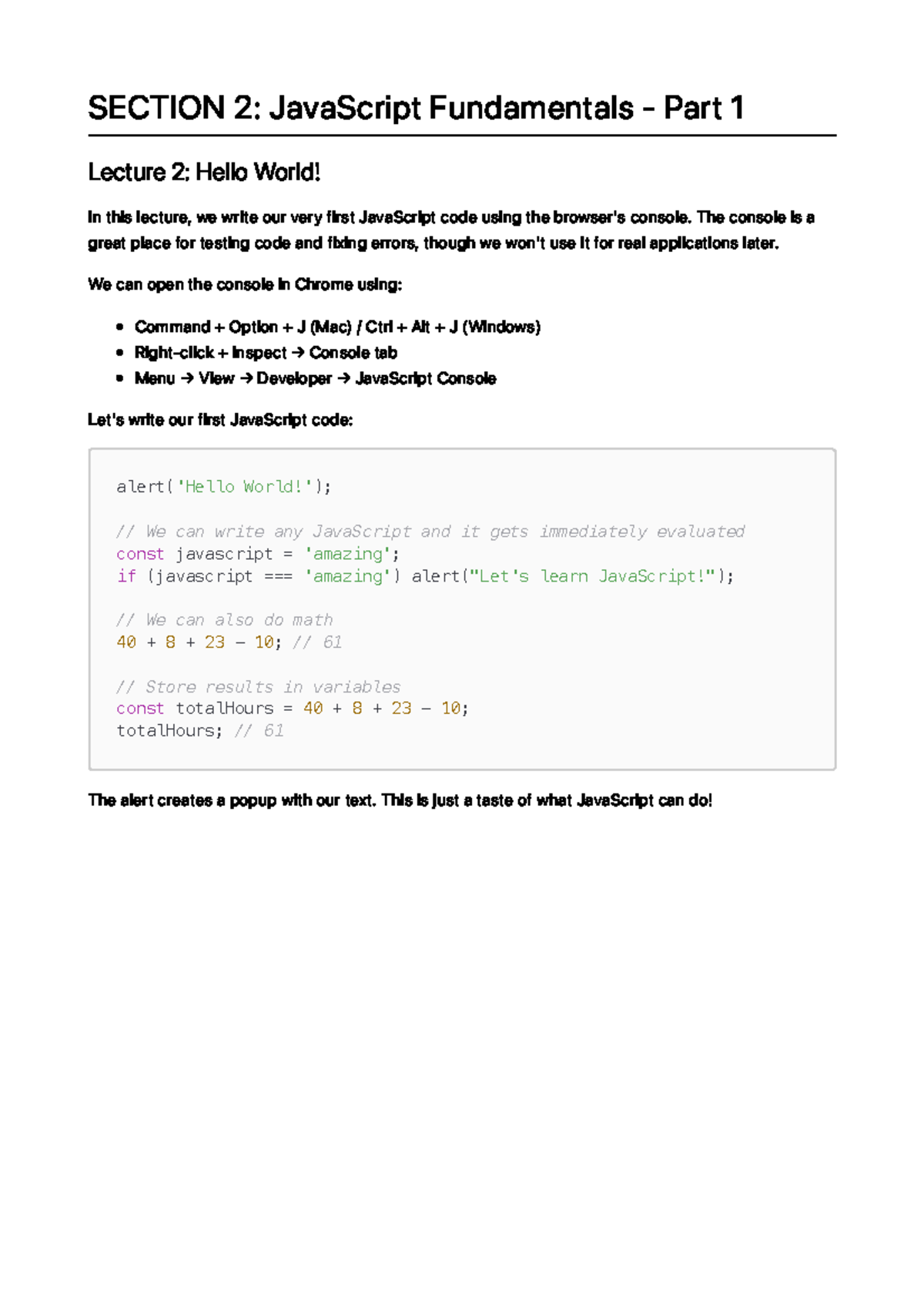 Based on this image's title: “JavaScript Fundamentals: Section 2 Summary (Lecture Notes) - Studocu”