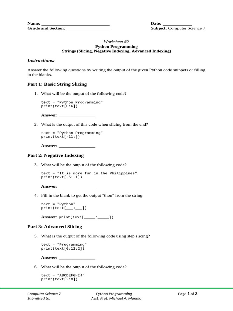 Python String Slicing Worksheet | PDF | Software Development | Software ...