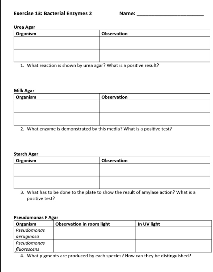 SOLVED: Exercise 13: Bacterial Enzymes 2 Name: Urea Agar Organism ...