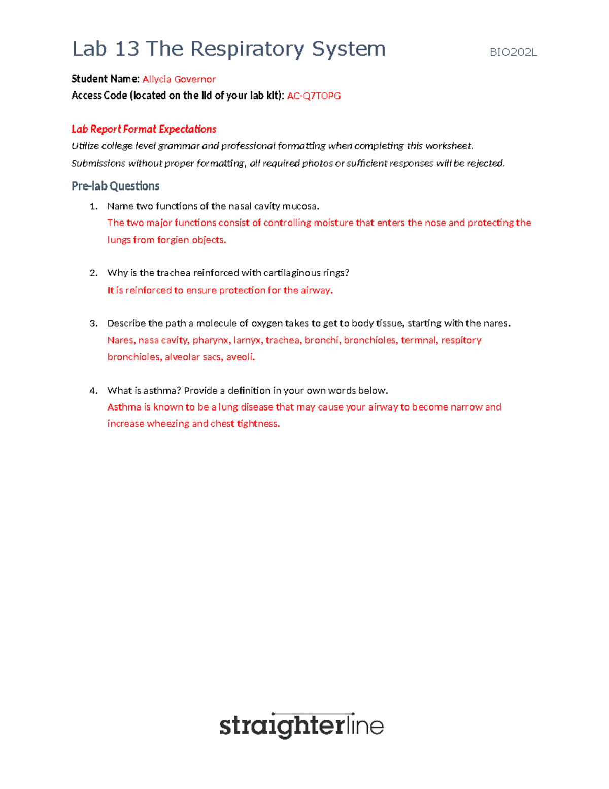 BIO202 Lab 13 - Bio lab 13 - Student Name: Allycia Governor Access Code ...