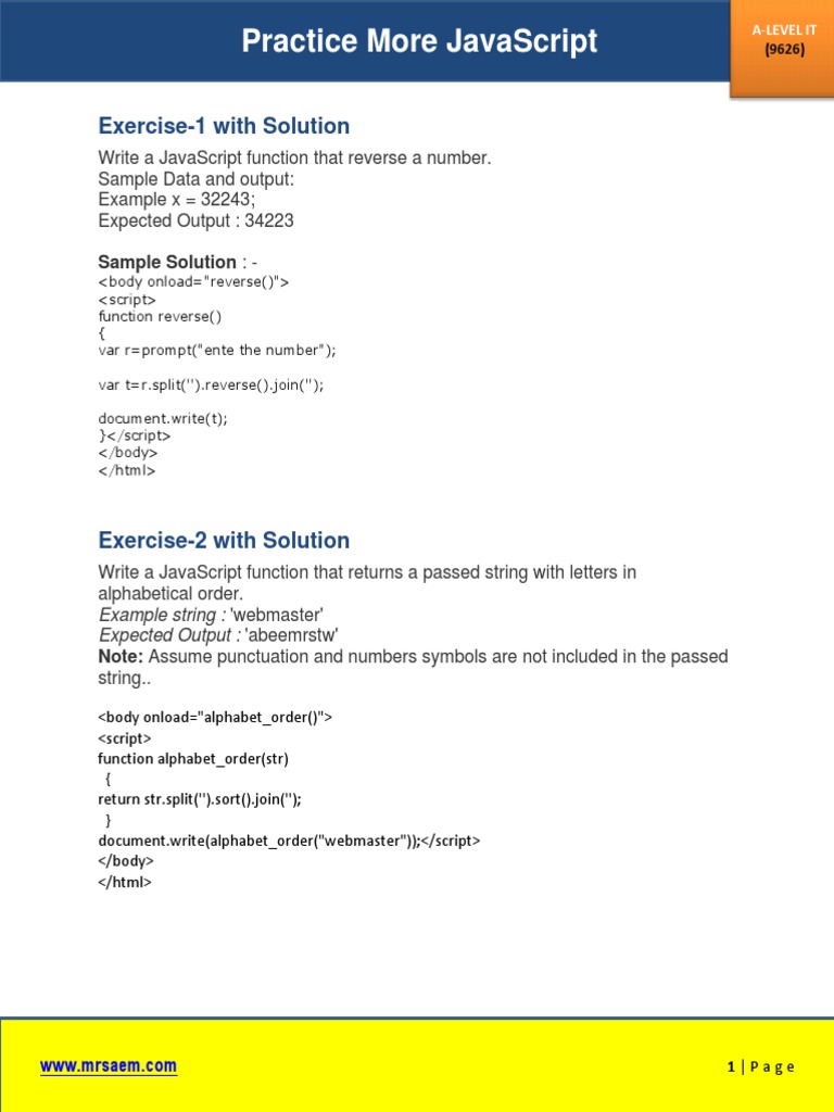 Based on this image's title: “Practice More Javascript: Exercise-1 With Solution | PDF | String ...”