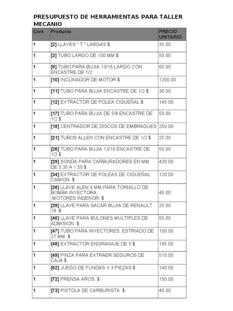 Presupuesto Taller Mecánico FL 3103 | PDF | Ingeniería mecánica ...