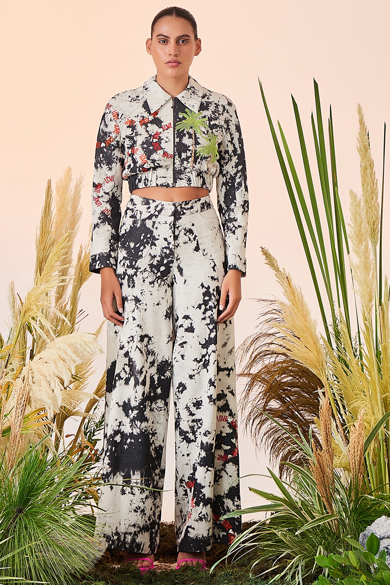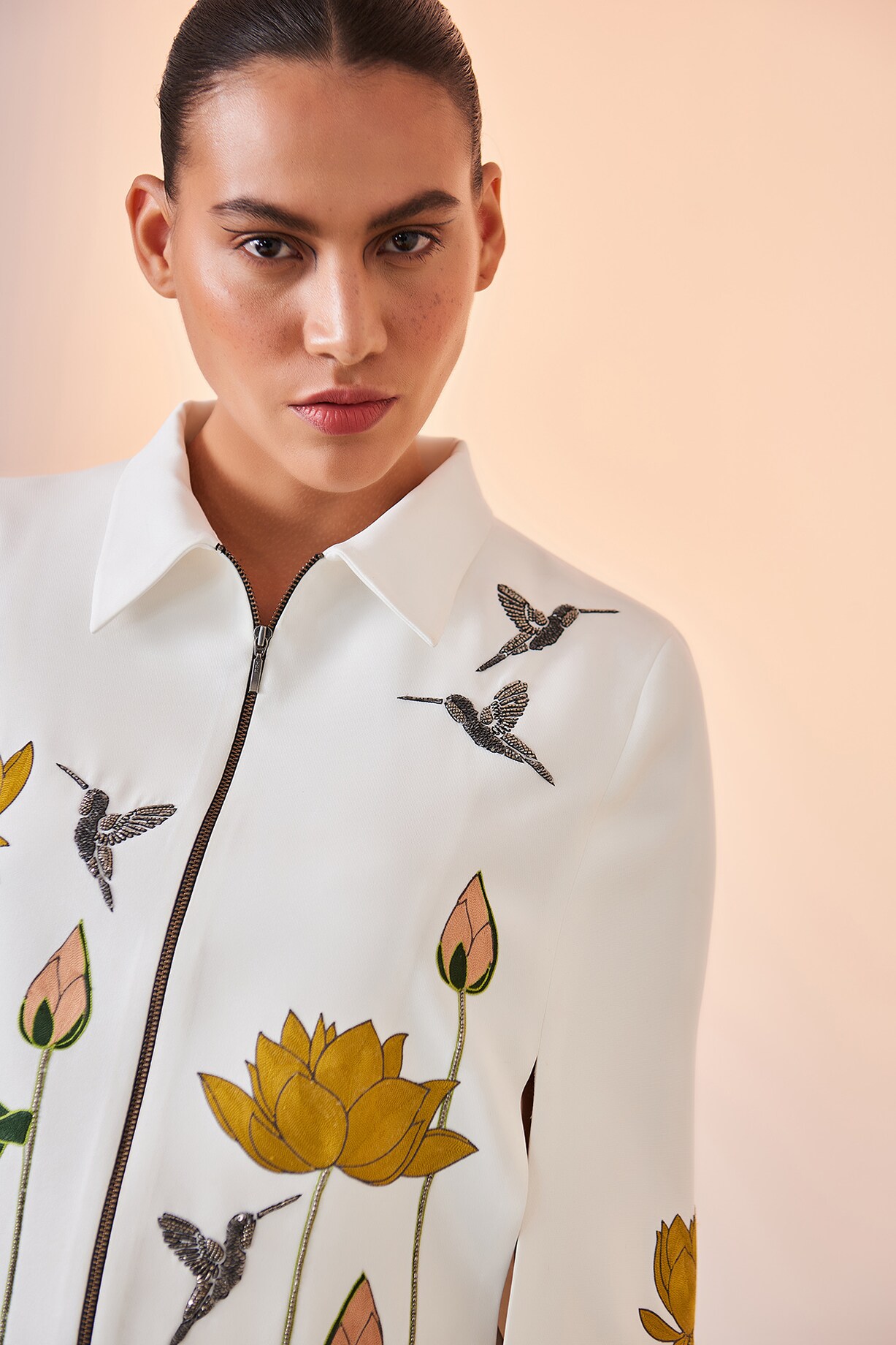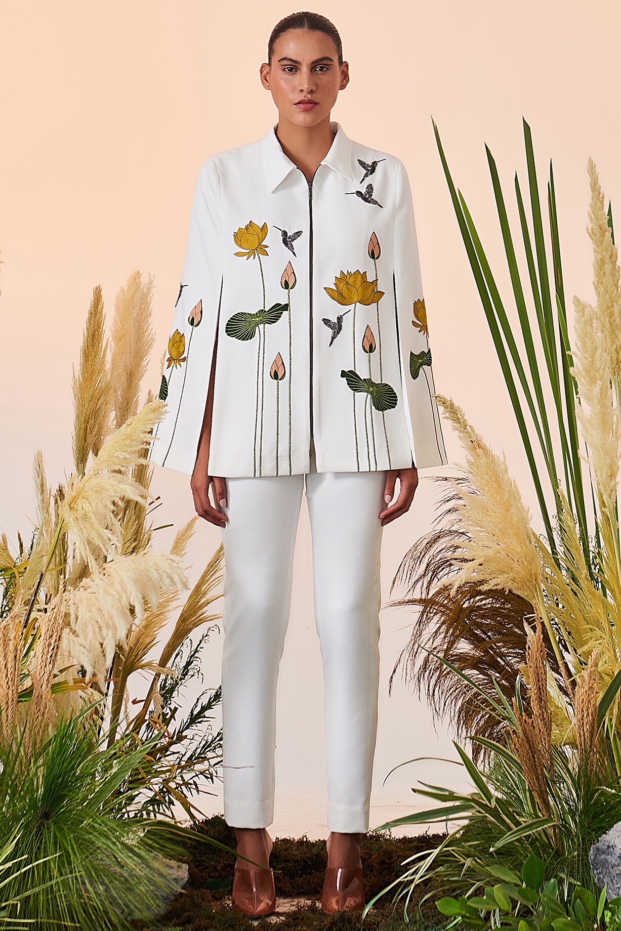 Buy White Gabardine Embroidered Fish And Prawn Collared & Jumpsuit For ...