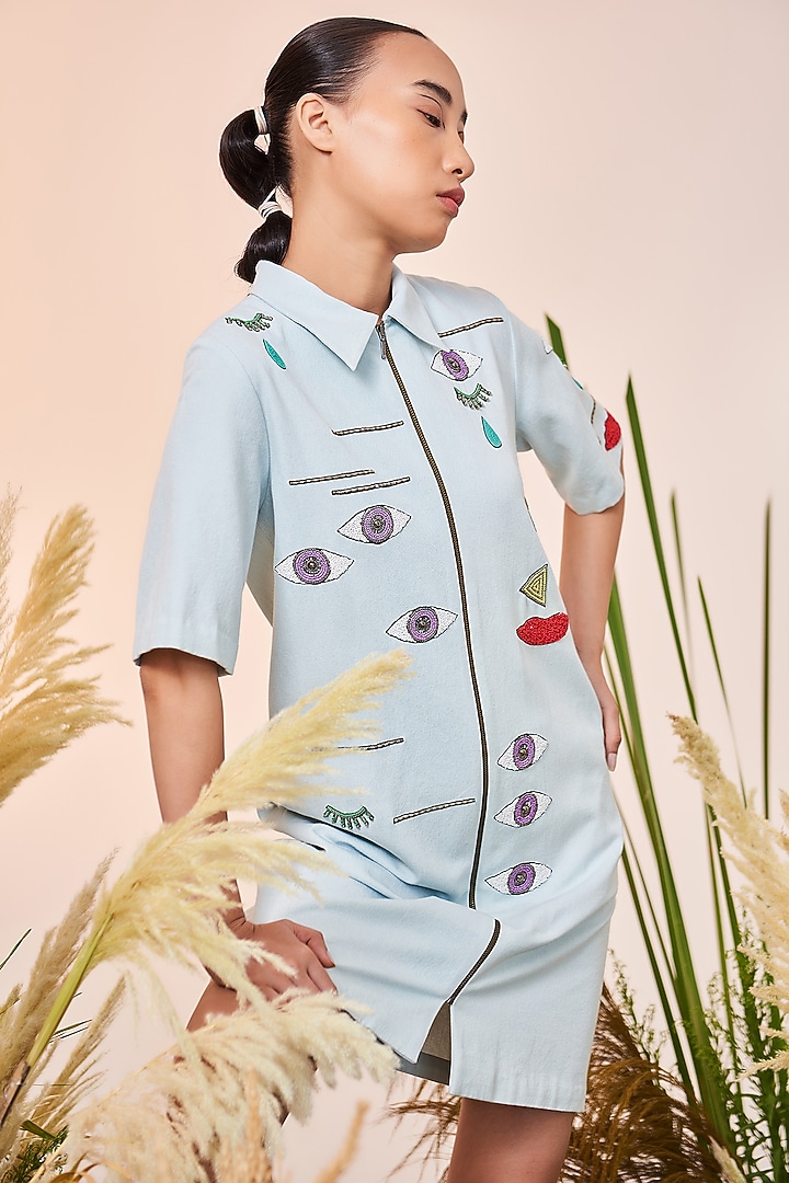 Light Blue Hand Embroidered Shirt Dress by Shahin Mannan at Pernia's ...
