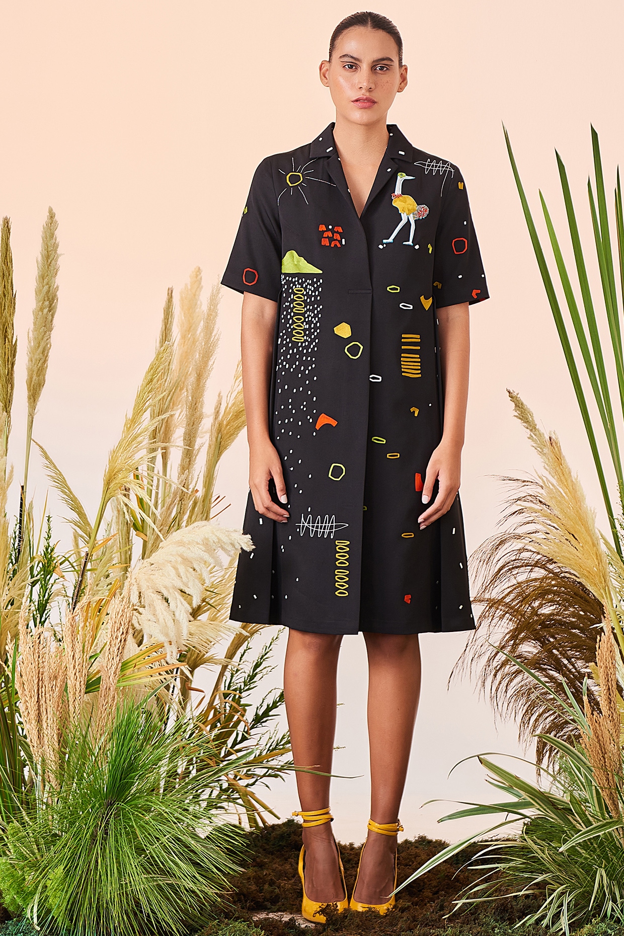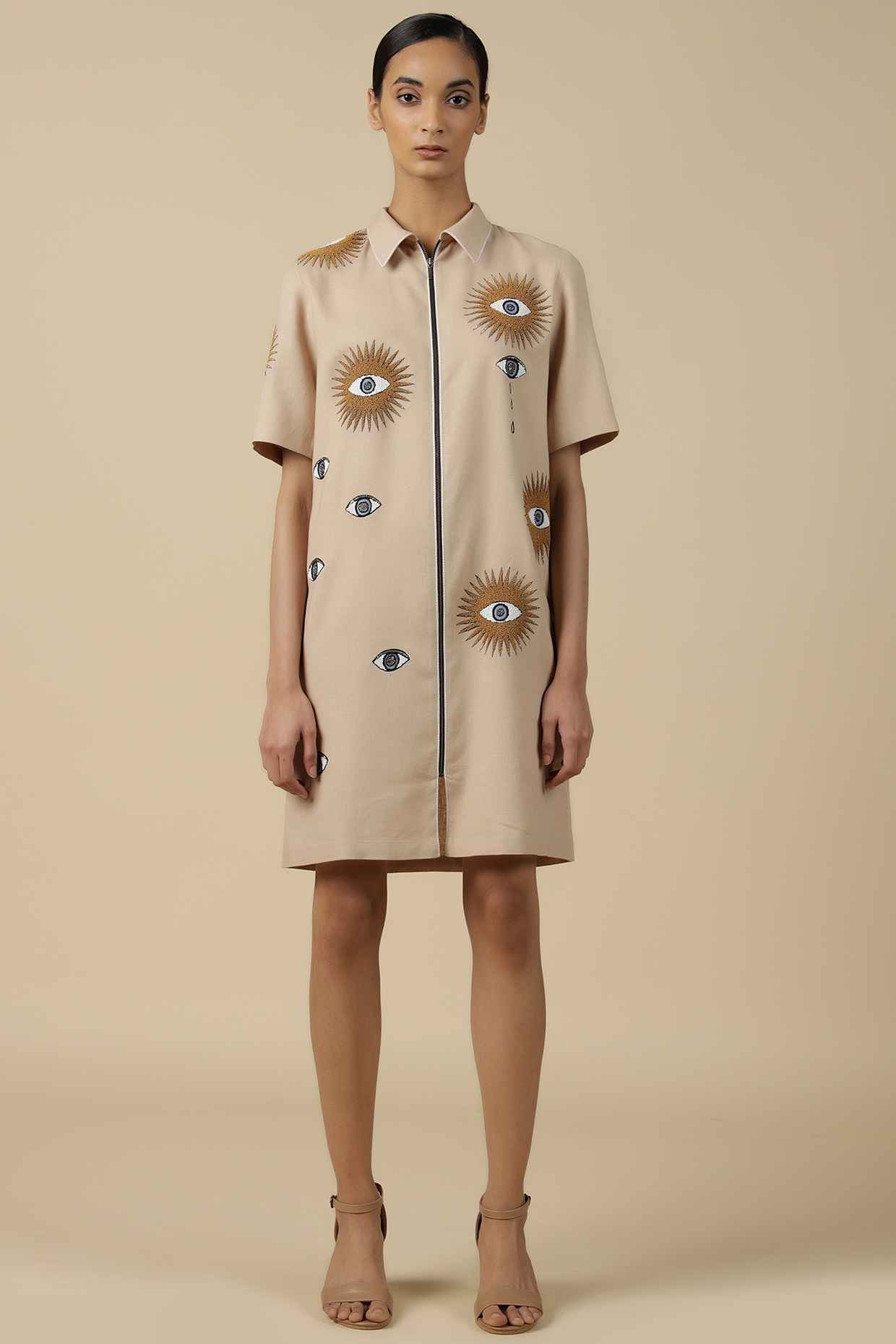Buy Beige Poplin Embroidered Dragonfly Motifs Notched Collar Coat Dress ...
