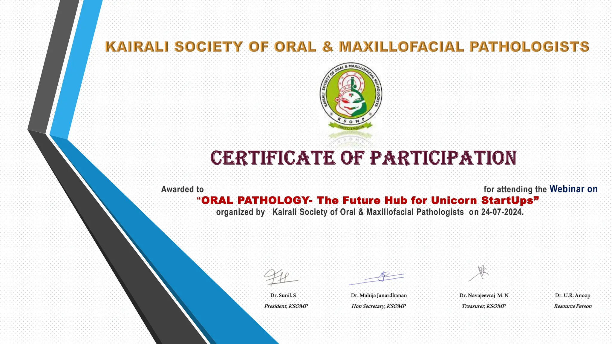 webinar certificate from kairali society of oral And Maxillofacial ...
