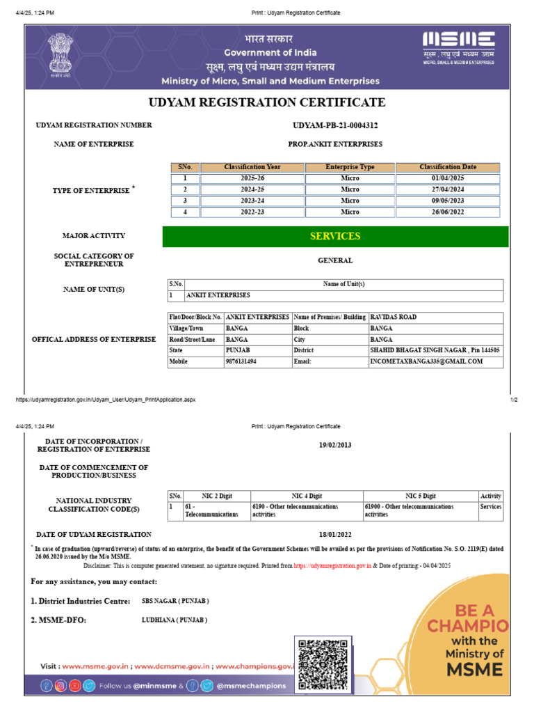 Print - Udyam Registration Certificate ANKIT ENTERPRISES | PDF