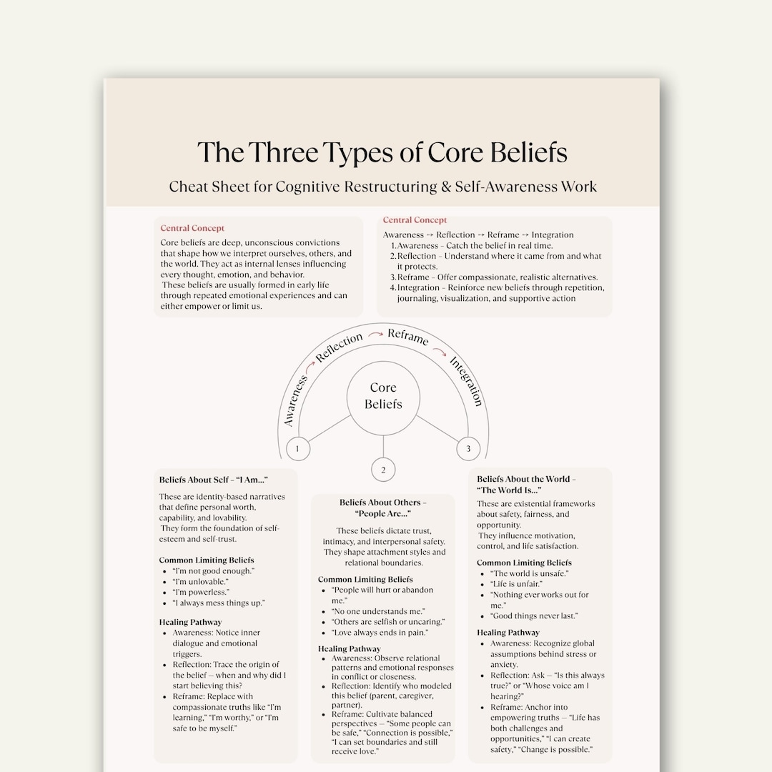 Core Beliefs Therapy Cheat Sheet, CBT Printable for Self Awareness ...