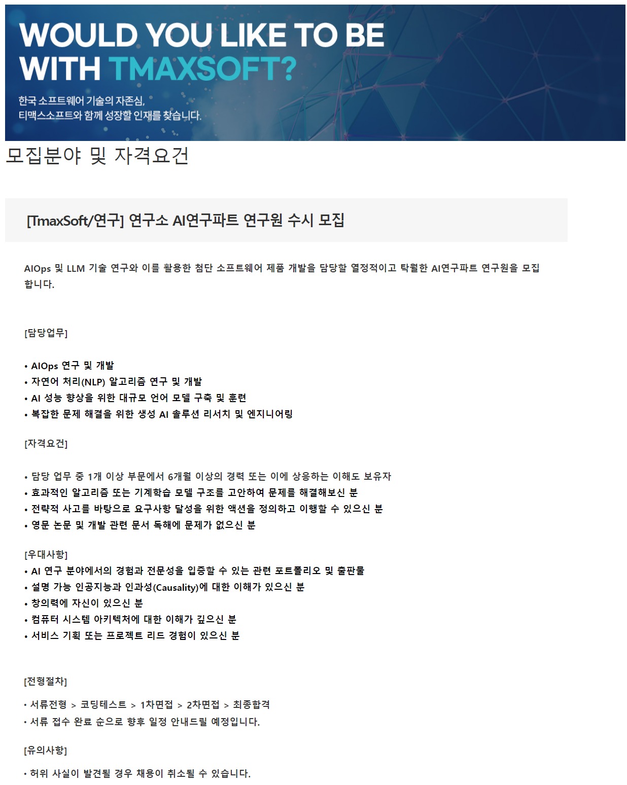 티맥스소프트 채용공고 - 연구소 AI연구파트 연구원 수시 모집 | 자소서 문항, 지원자 스펙 분석까지