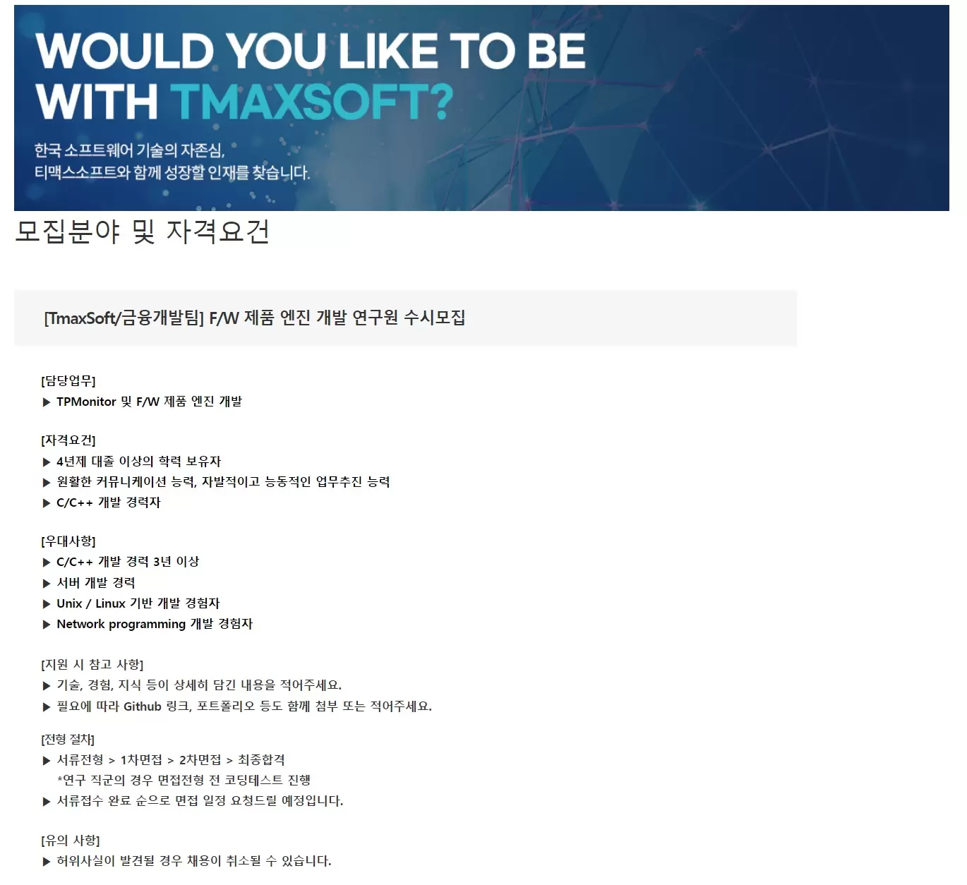 티맥스소프트 채용공고 [금융개발팀] F/W 제품 엔진 개발 연구원 수시모집 | 2023년 채용